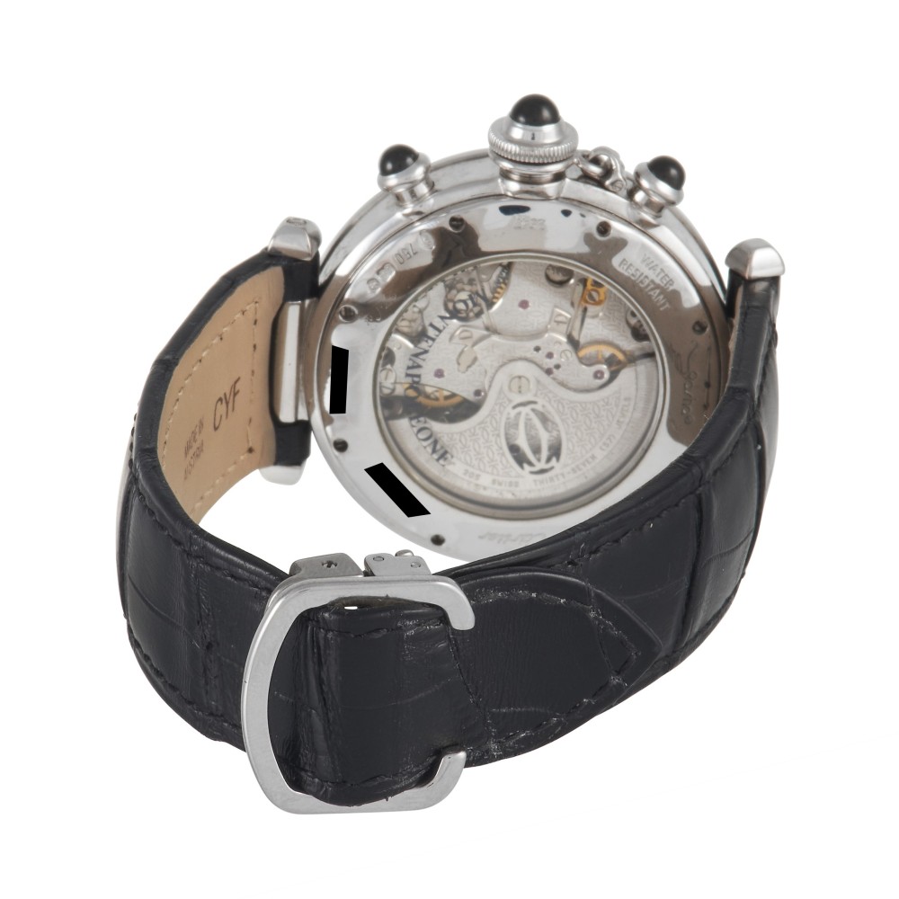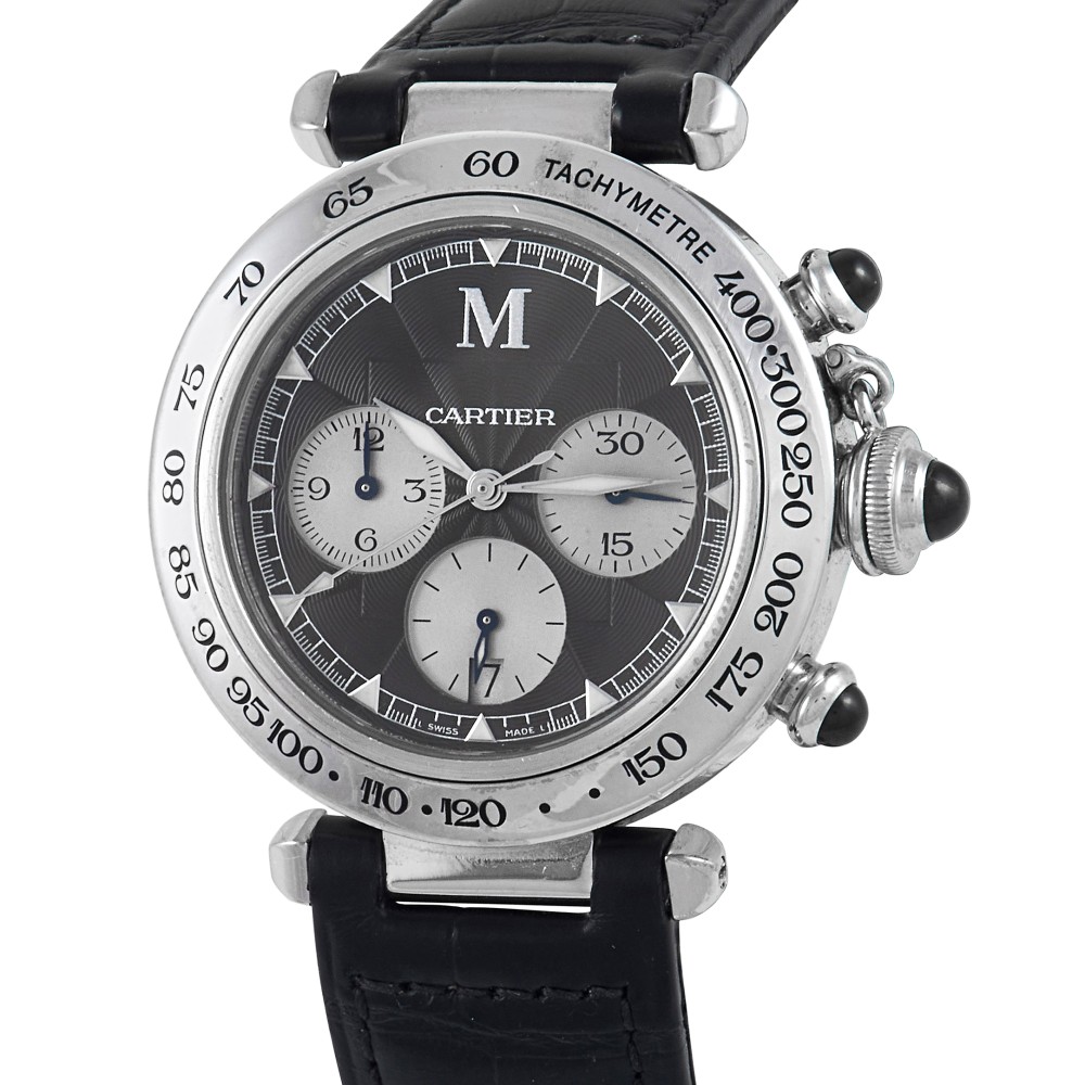 The round sporty watch with a crown-cap, this Pasha de Cartier Chronograph is resilient enough to keep pace with an active lifestyle. This model made for the Italian market bears a Montenapoleone mark at the back, an applied “M” mark at 12 o’clock position, and a bezel with a tachymeter scale numbered from 60 to 400. This is a rare timepiece distributed in a limited-edition series of 25 pieces. The watch comes with a white gold case with a dark grey guilloch? dial with three silver subdials. The face of the watch comes with luminescent triangular hour markers, luminescent diamond hands and blued steel chrono hands. A date window at 6 o’clock is positioned inside the subdial. The crown cap, crown and push-pieces are set with synthetic black spinels. Powering this watch is caliber 205 with 37 jewels.