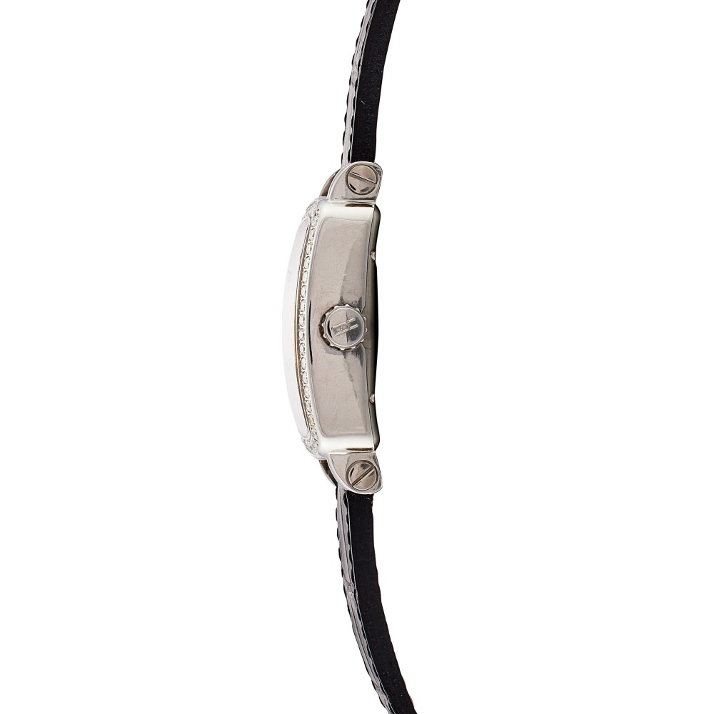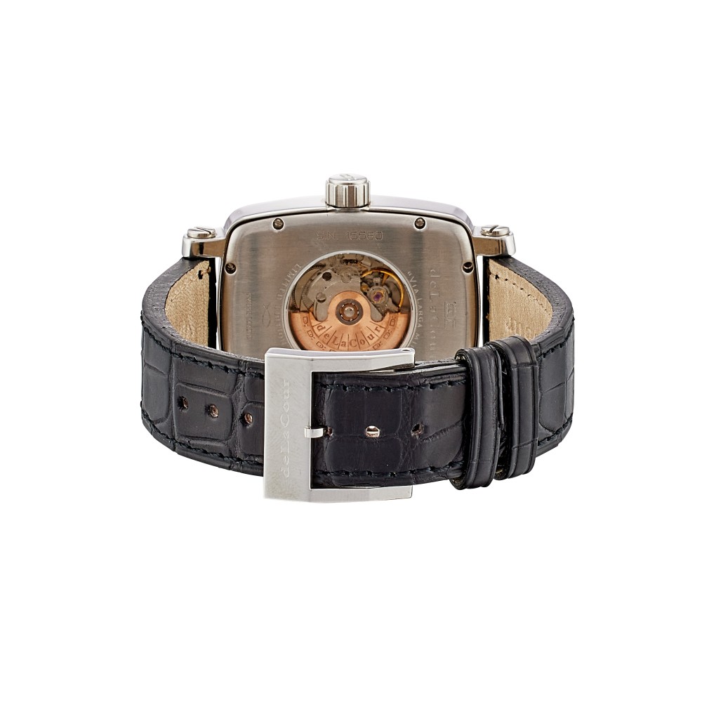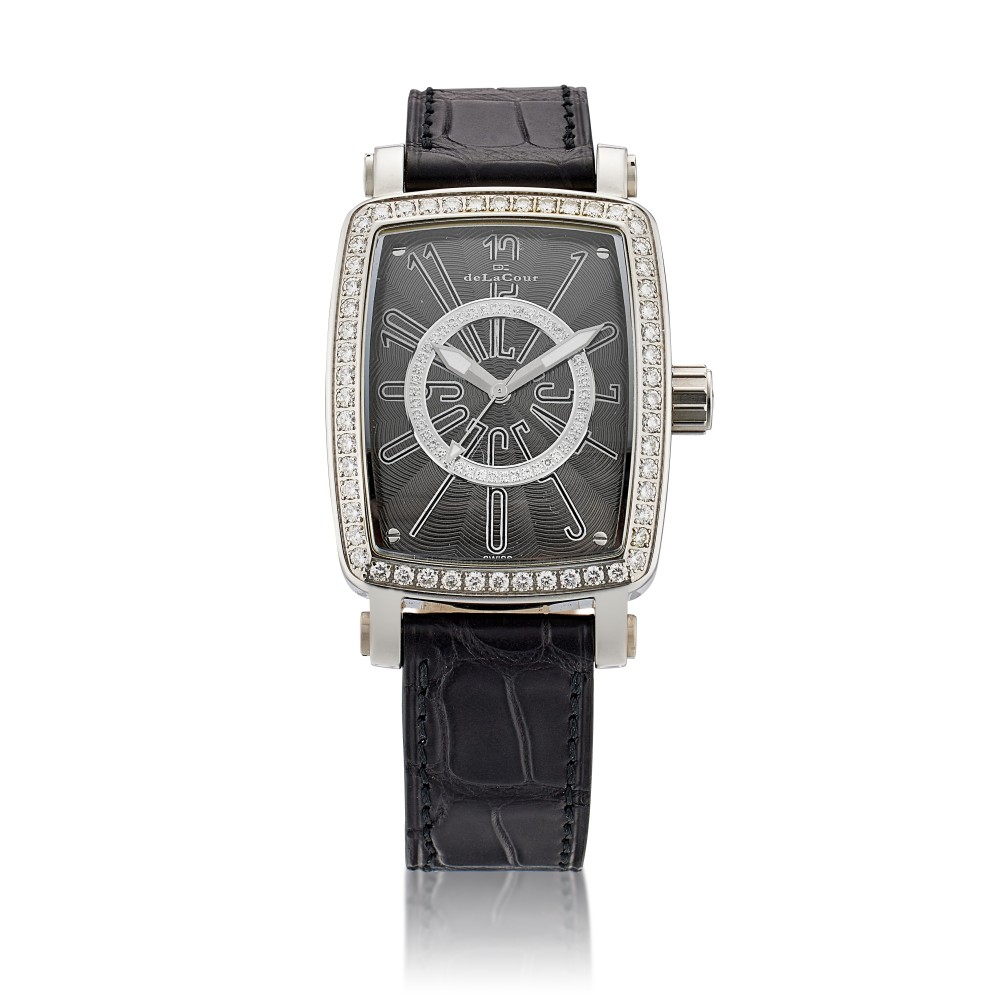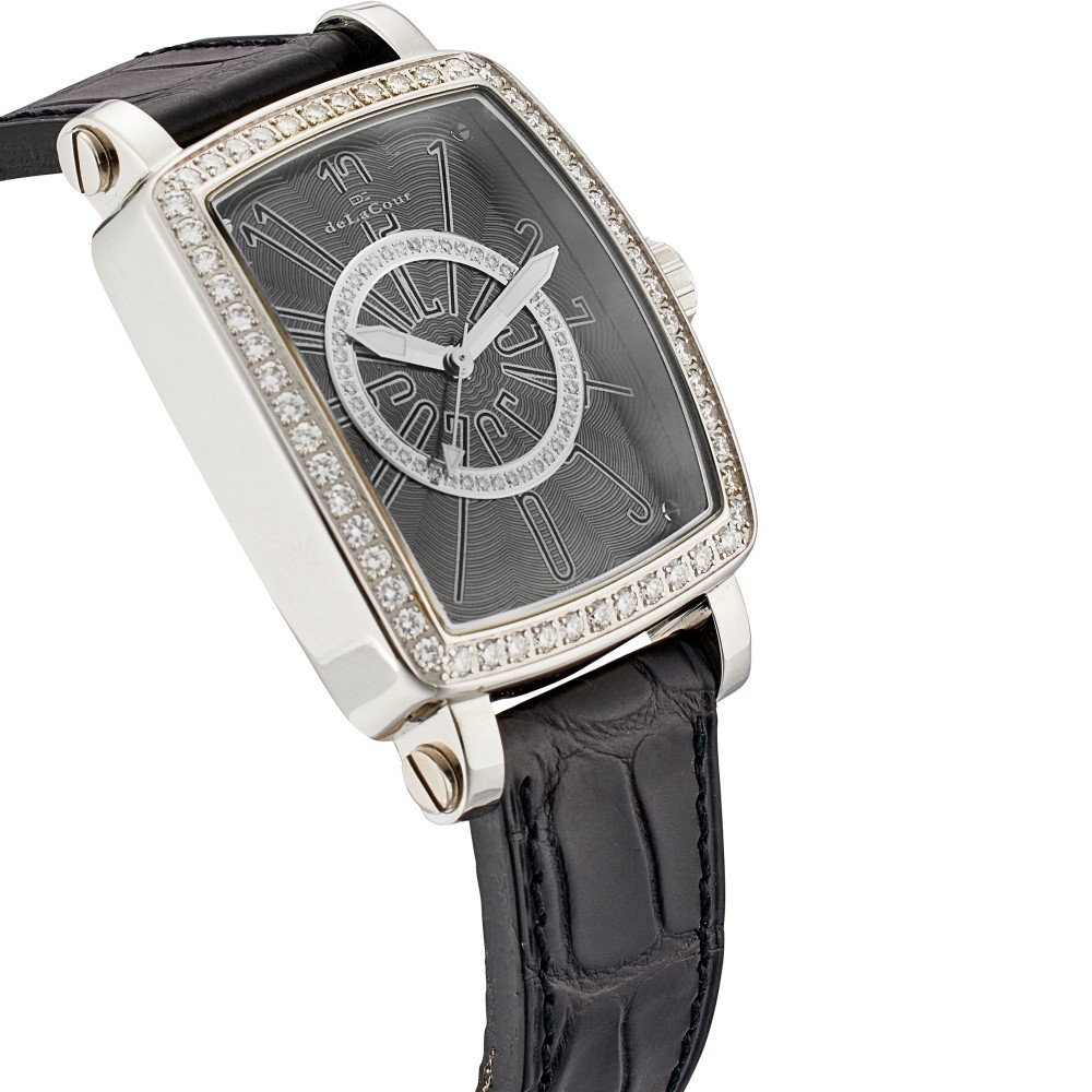deLaCour is a Swiss watch company founded in 2002 by Herv? de La Court. The brand is known for producing high-quality, luxury timepieces that are inspired by the art, culture and history of Switzerland. The Bichrono was the first timepiece released by deLaCour in 2003 and it set the tone for future collections maintaining the brand’s staple tonneau shape. An artistic debut to the brand’s case, deLaCour’s Bichrono houses an innovative two time zones powered by two independent chronograph movements. The original Bichrono comes with a titanium dial and two automatic caliber CD241 movements with a power reserve 37 hours, housing 33 jewels. The Bichrono was nominated for the “Best Design” category by the Geneva Watchmaking Grand Prix upon the brand’s unveiling in 2003. A year later, it won the “Unique Design Watch of the Year” award in Tokyo. This limited edition Via Larga Mini reference SN 15560 is a stainless steel automatic wristwatch with black alligator strap. Automatic movement with sapphire displayed case back. Stainless steel case and buckle. Grey dial with diamond decorated.