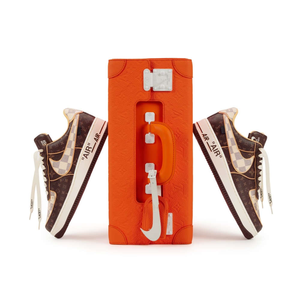 The sneakers (limited to 200 total pairs), entirely made in leather, were embellished with Louis Vuitton?s emblematic Monogram and Damier patterns with natural cowhide piping. Each pair came with a Louis Vuitton pilot case, also from the Louis Vuitton Spring-Summer 2022 collection, which was reinterpreted from the Maison?s archive in an iconic orange colorway and made of Monogram Taurillon Leather. The pilot case features Louis Vuitton?s classic S lock closure in white metal finishing and includes a luggage tag in the shape of the Nike Swoosh. The pilot case adapts to every shoe size, based on an internal cushion system. It was sold exclusively with this pair.