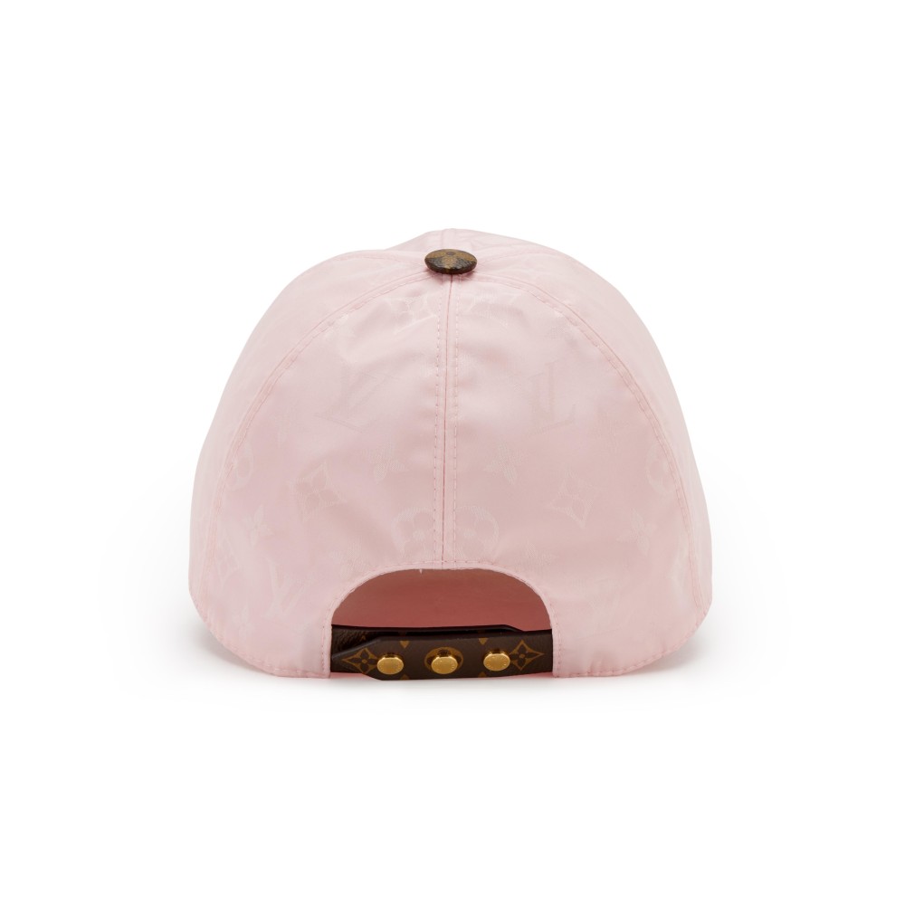 The LV Get Ready Cap was released as part of a capsule collection for Fall-Winter 2021. The cap features a pastel pink allover print LV Monogram pattern and a brown monogram bill. The LV Get Ready Cap adjusts using a leather strap with three Louis Vuitton logo-engraved snaps.