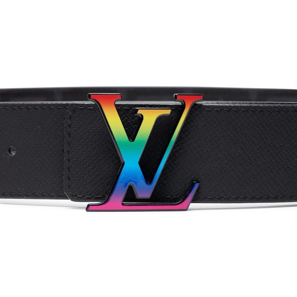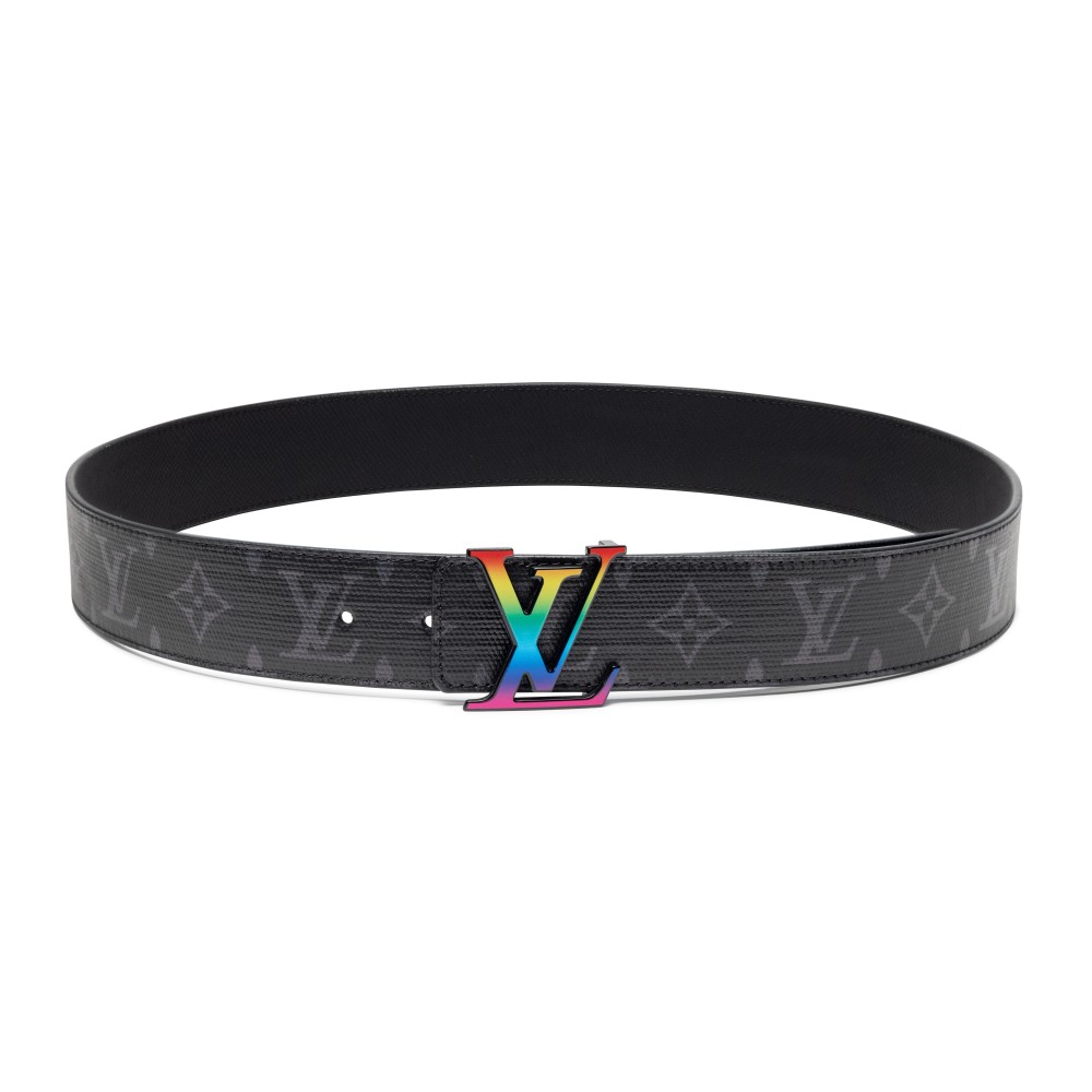 Released as part of Louis Vuitton?s Fall/Winter 2019 collection, helmed by both Virgil Abloh and Nicolas Ghesqui?re, the Initiales Reversible Eclipse belt features a Taiga leather and rainbow “LV” buckle. The recto side of the belt displays an LV Monogram pattern in grey, while the verso side is solid black leather.
