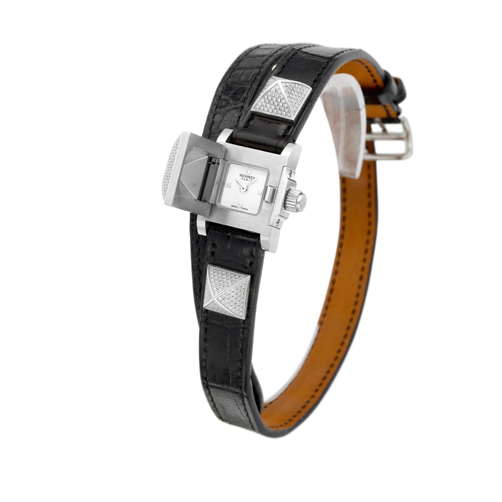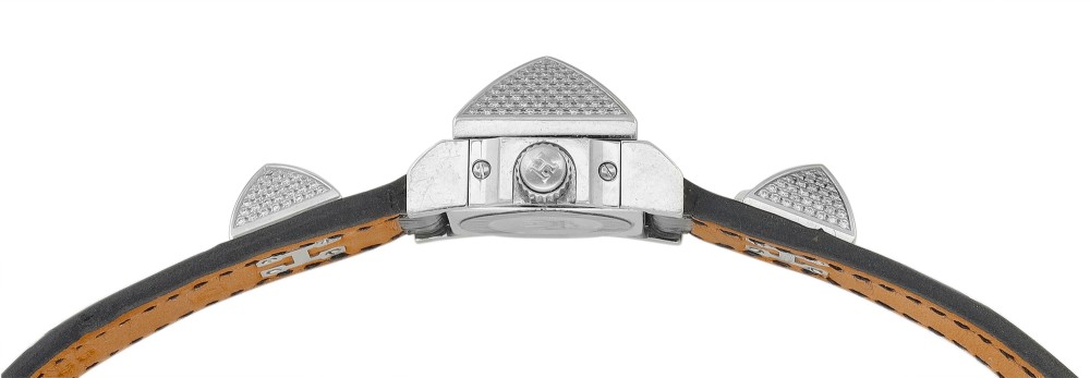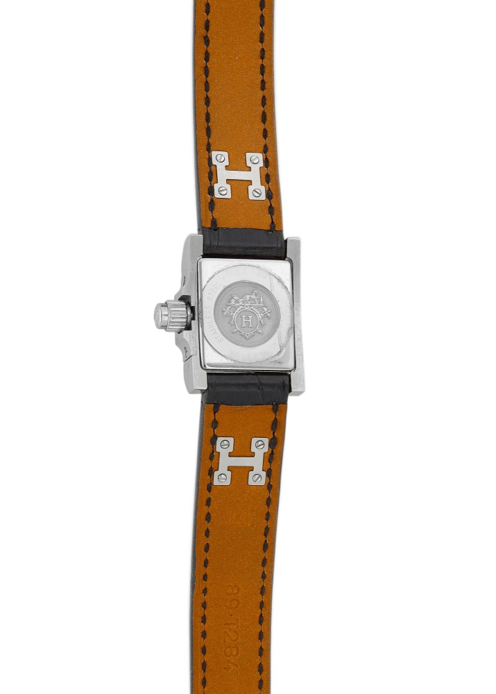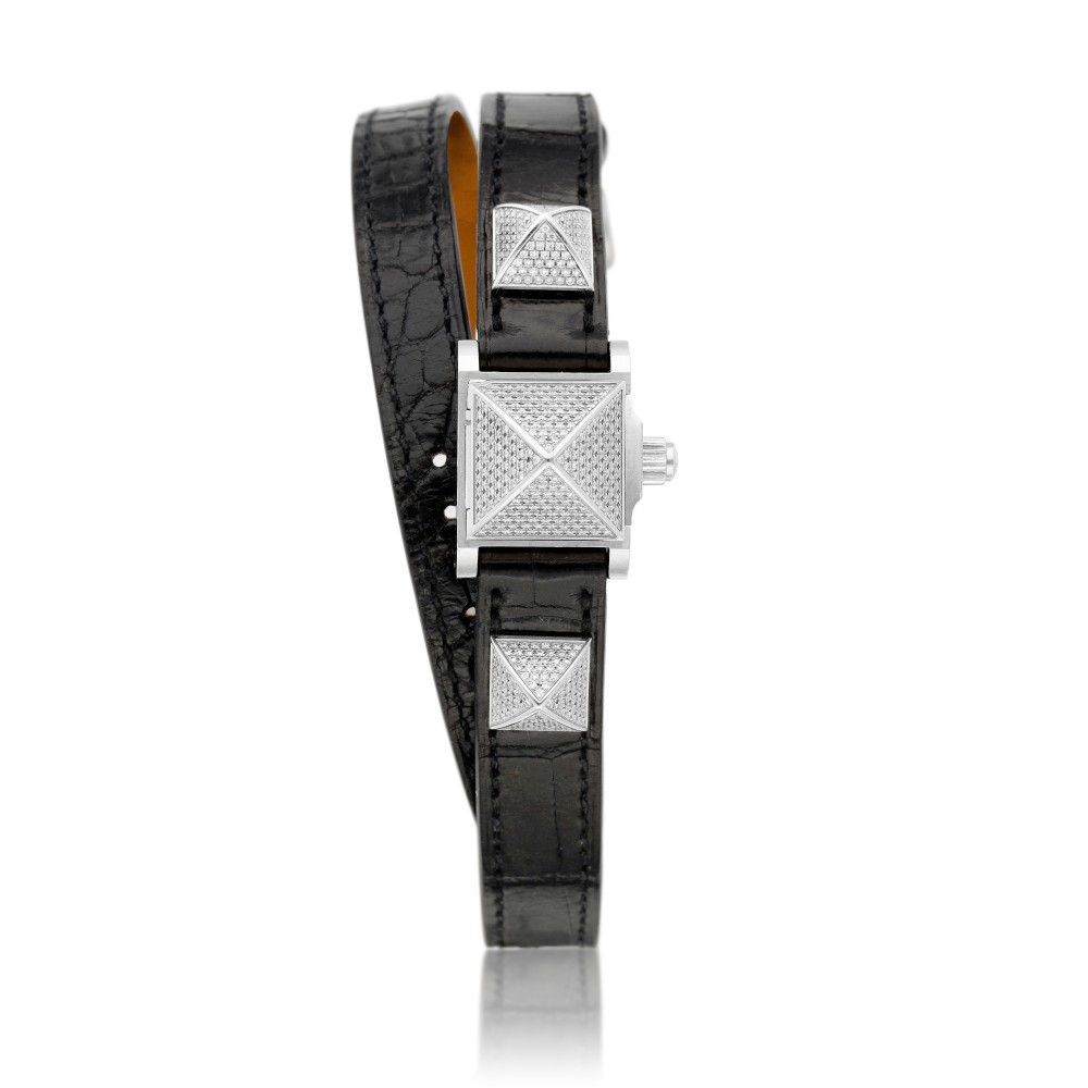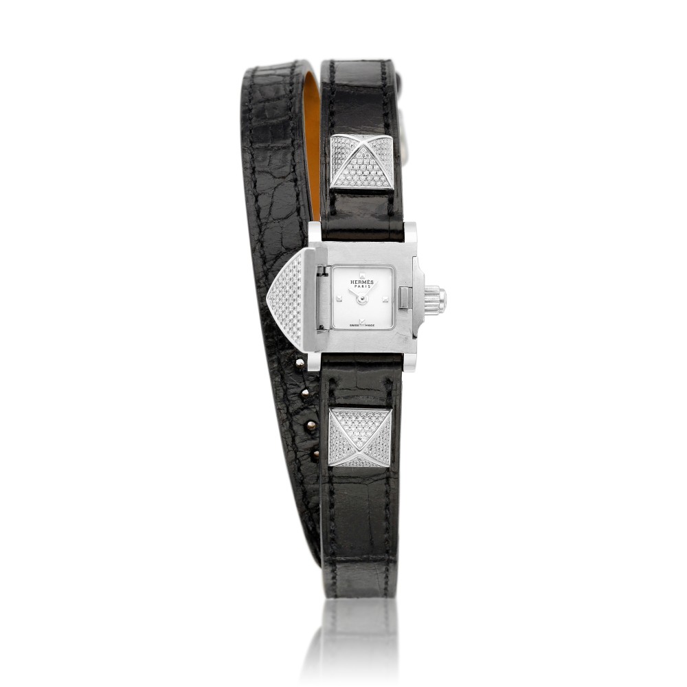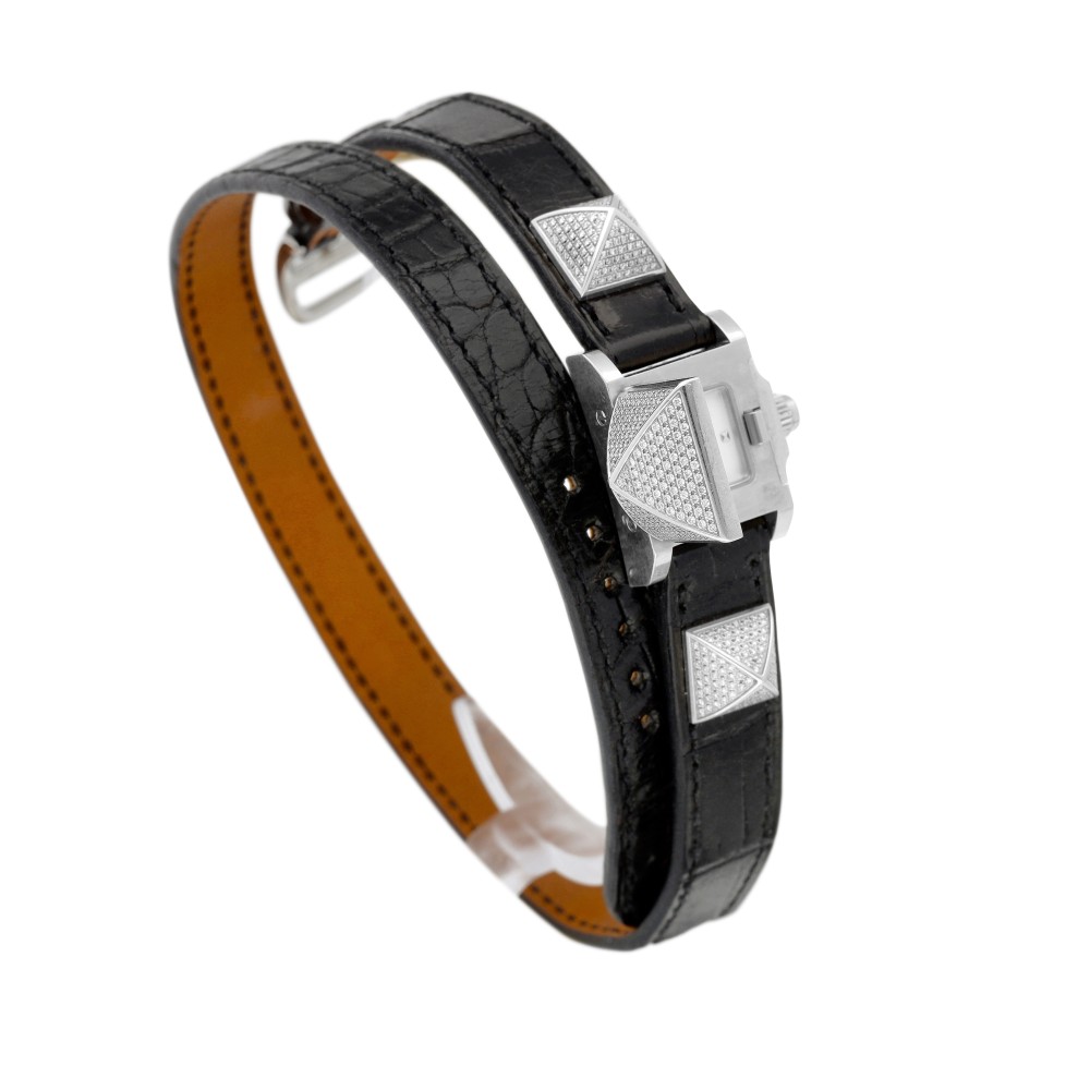 The Herm?s Medor watch was inspired by one of the brand’s first products, the dog collar, and transformed into a secret watch in the early ’90s. The largest of three pyramid studs in the center opens to reveal the opaline silvered dial of the watch.
