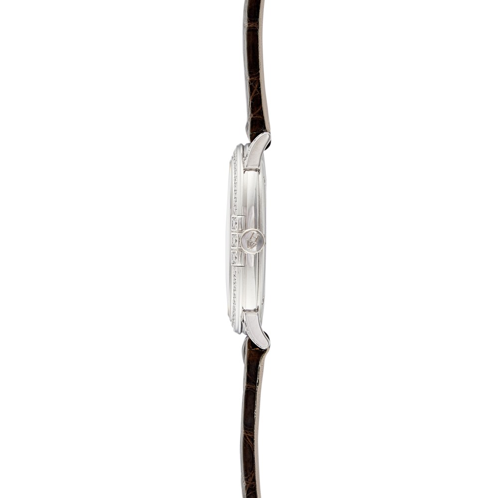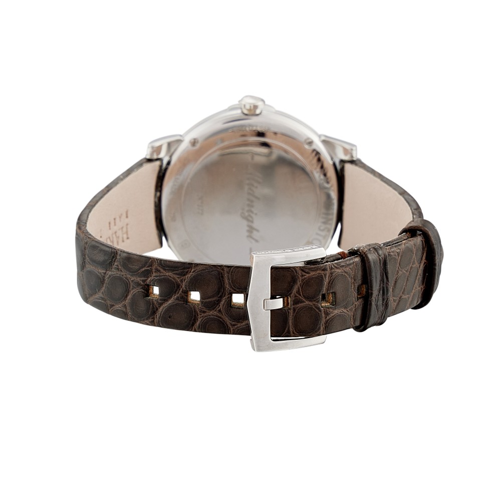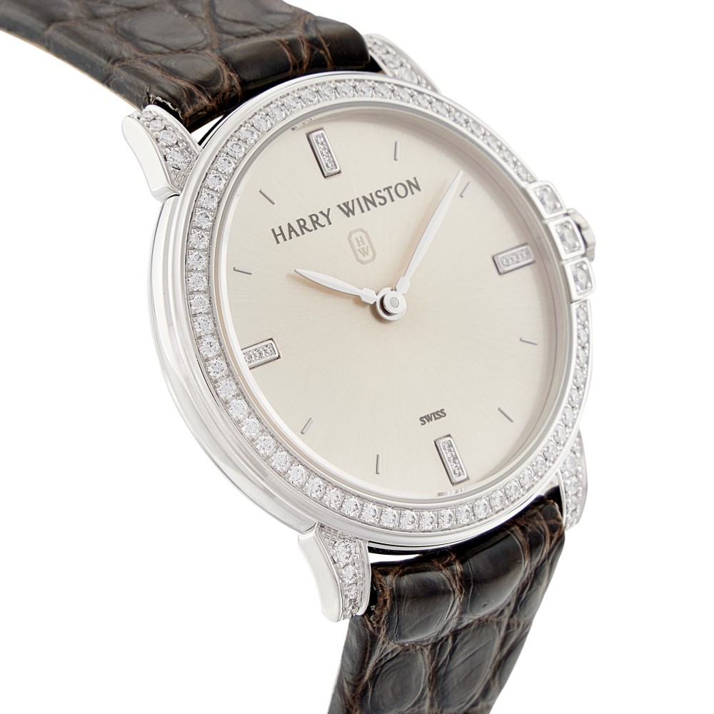 Harry Winston (March 1, 1896 ? December 8, 1978) was an American jeweler. He donated the Hope Diamond to the Smithsonian Institution in 1958 after owning it for a decade. He also traded the Portuguese Diamond to the Smithsonian in 1963 in exchange for 3,800 carats of small diamonds. The House of Harry Winston entered the world of watchmaking in 1989 with the Premier Collection. Since then, it has established itself as a leading creator of fine timepieces with a varied portfolio of models, from the classical purity of the Midnight Collection to the contemporary elegance of the Ocean Collection. This Midnight reference 450/LQ32W is a white gold quartz wristwatch, 18k white gold case in diameter 32mm with diamond bezel and lugs, silver dial with diamond indexes. Brown alligator strap with white gold pin buckle.