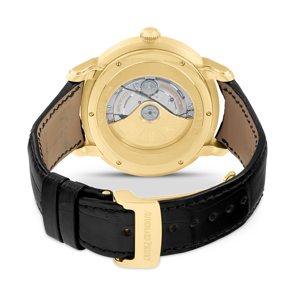 Audemars Piguet Millenary with a 45 mm rose gold case and a sapphire glass, water-resistant; inside is the automatic caliber 3120, a silver Roman face with date indication, the bracelet is an alligator leather; accessory: Bucherer box.