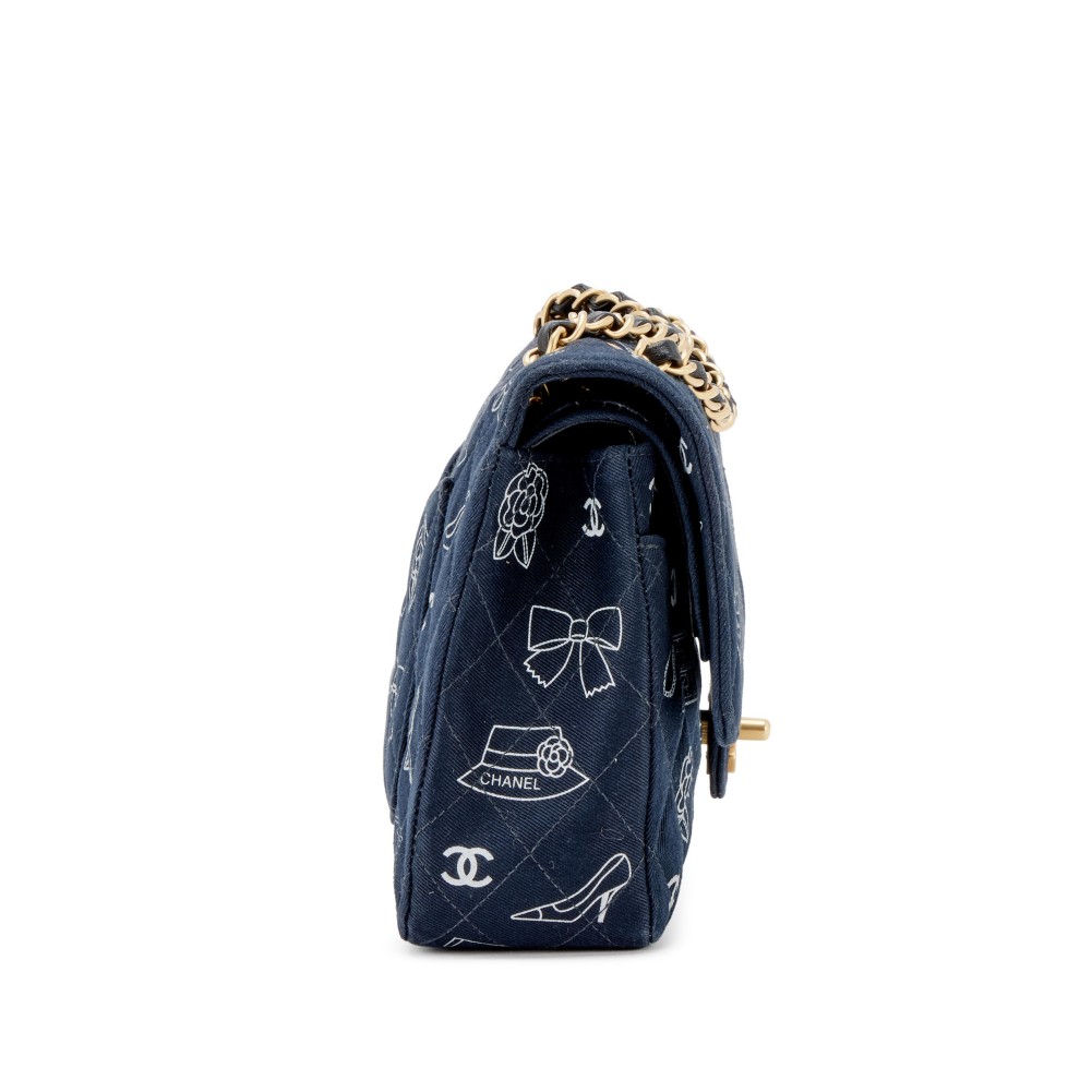 Chanel Navy and White Quilted Canvas Icon Print Medium Classic Double Flap Gold Hardware, 2002