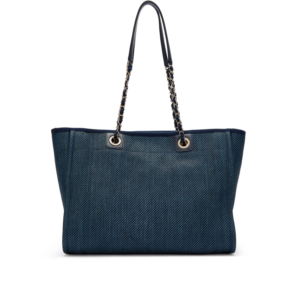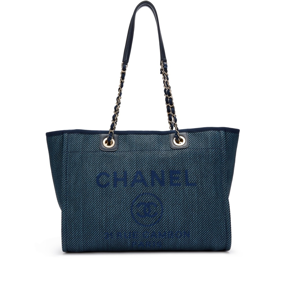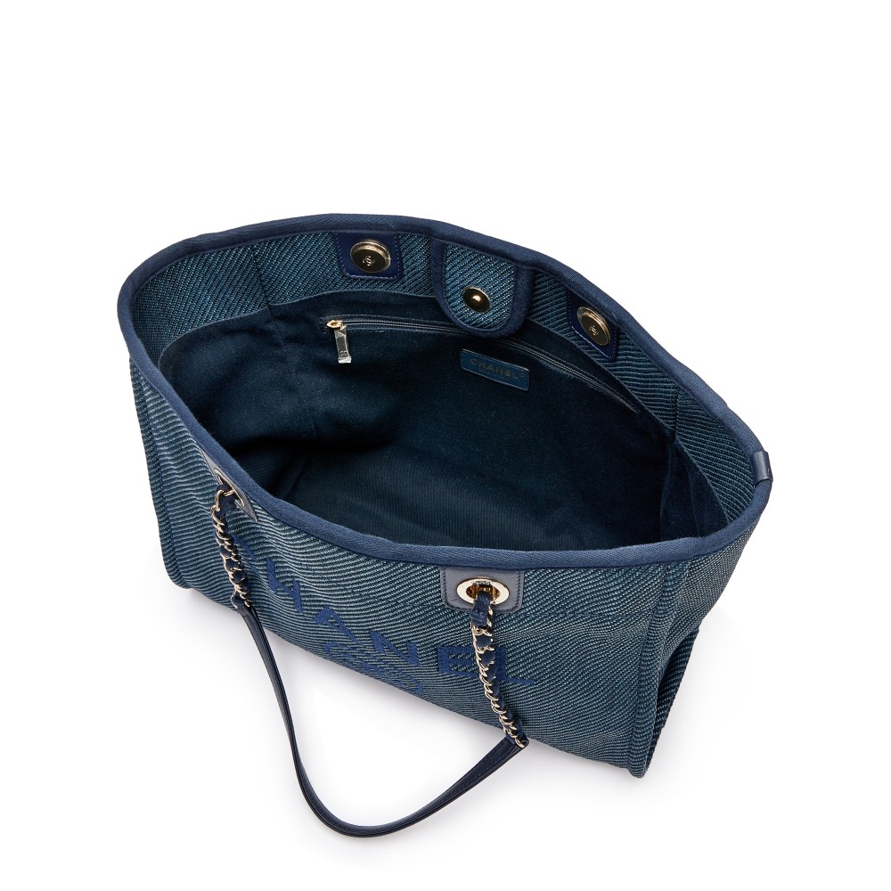 Chanel Navy Canvas Small Deauville Tote Pale Gold Hardware, 2020