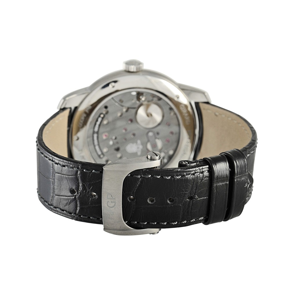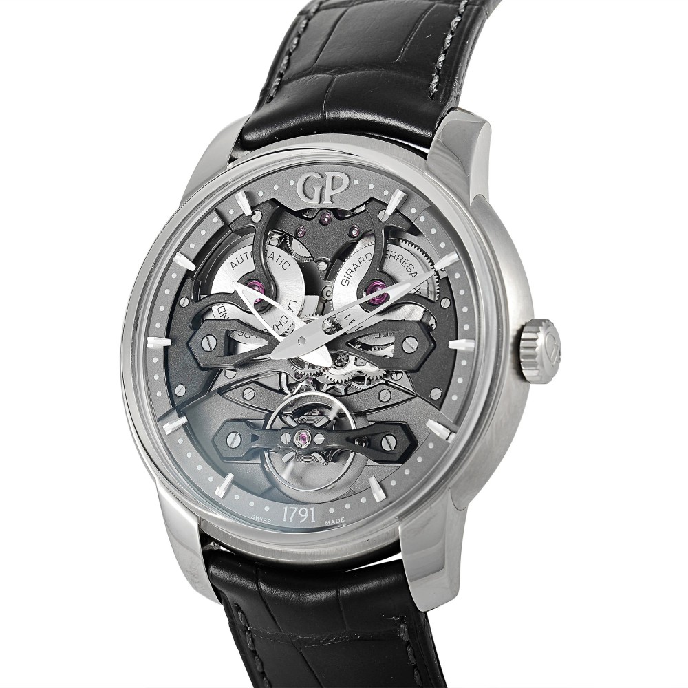 This impeccably designed accessory starts with a 45mm titanium case, which pairs beautifully with the black crocodile strap. On the striking skeleton dial, you?ll find brushed skeleton hands with luminous filled tips, and applied index hour markers with luminous centers. This watch is powered by an automatic Girard Perregaux Caliber GP08400 movement with 48 hours of power reserve.