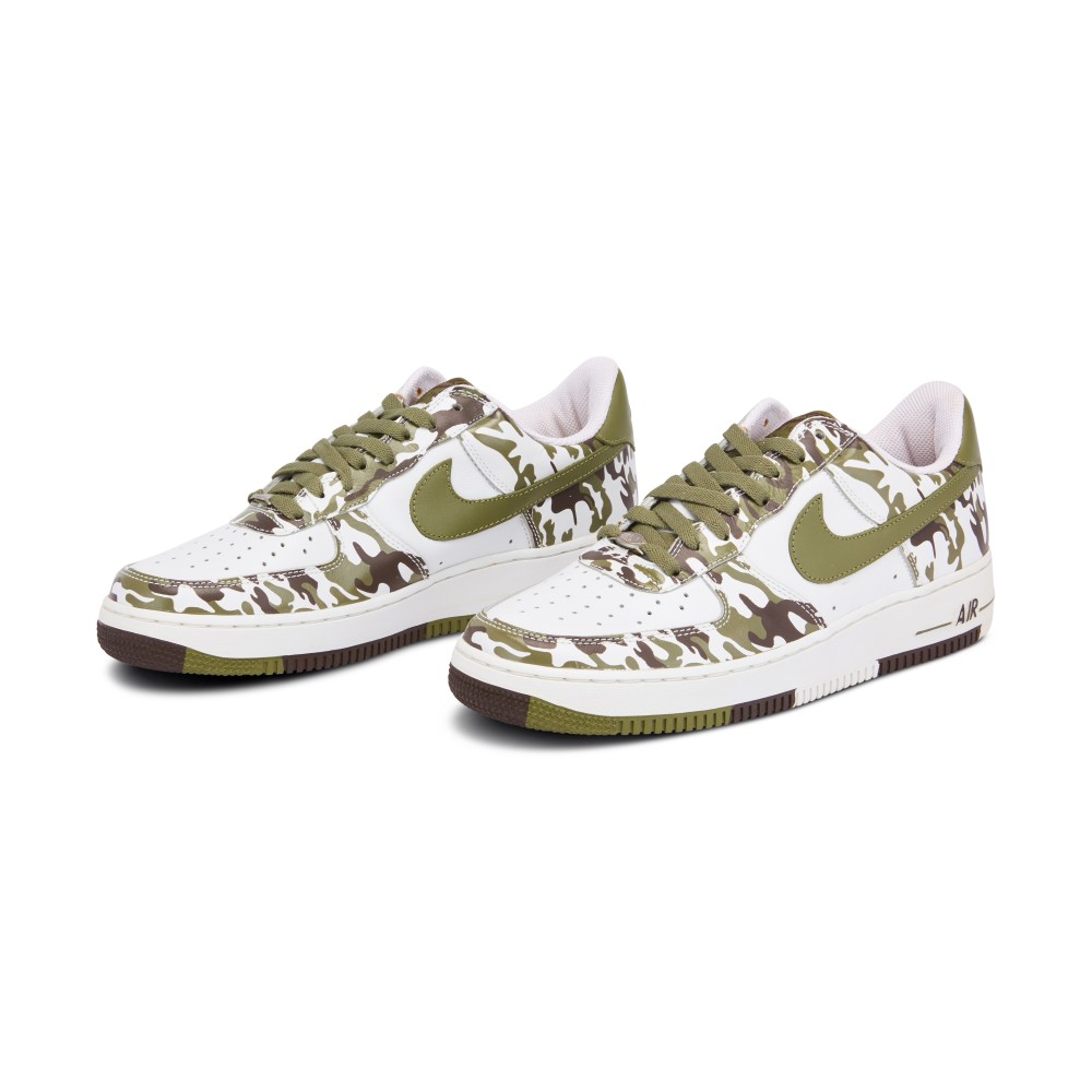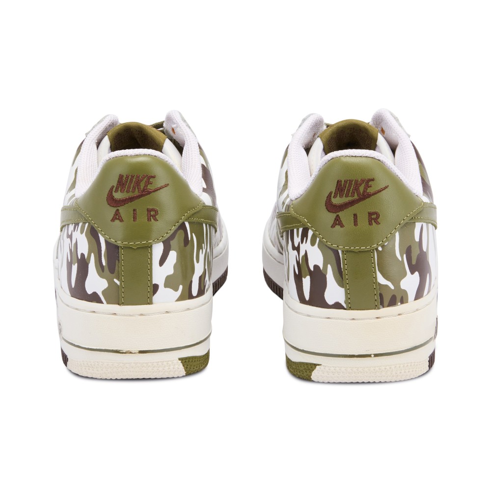 - White leather upper with Palm Green and Baroque Brown camo pattern.