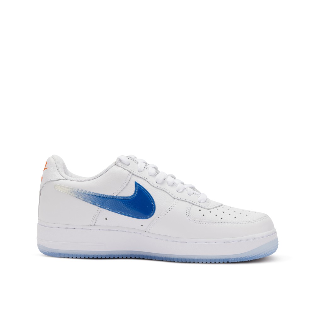 The Nike x Kith Air Force 1 Low “NYC Home” was released in collaboration with Kith, the NYC-based retail store founded by Ronnie Fieg in 2011. The pair was released in 2020 and pulled inspiration from the retailer?s hometown NBA team, the New York Knicks, incorporating a mix of Rush Blue and Brilliant Orange on the classic Air Force 1 low silhouette. The upper consists of white tumbled leather, and mismatched gradient TPU Swooshes in blue and orange. A NYC Swoosh graphic can be found on the lateral heel, along with Kith Air branding embroidered on the heel patch. The design is finished with an icy blue, translucent rubber outsole.