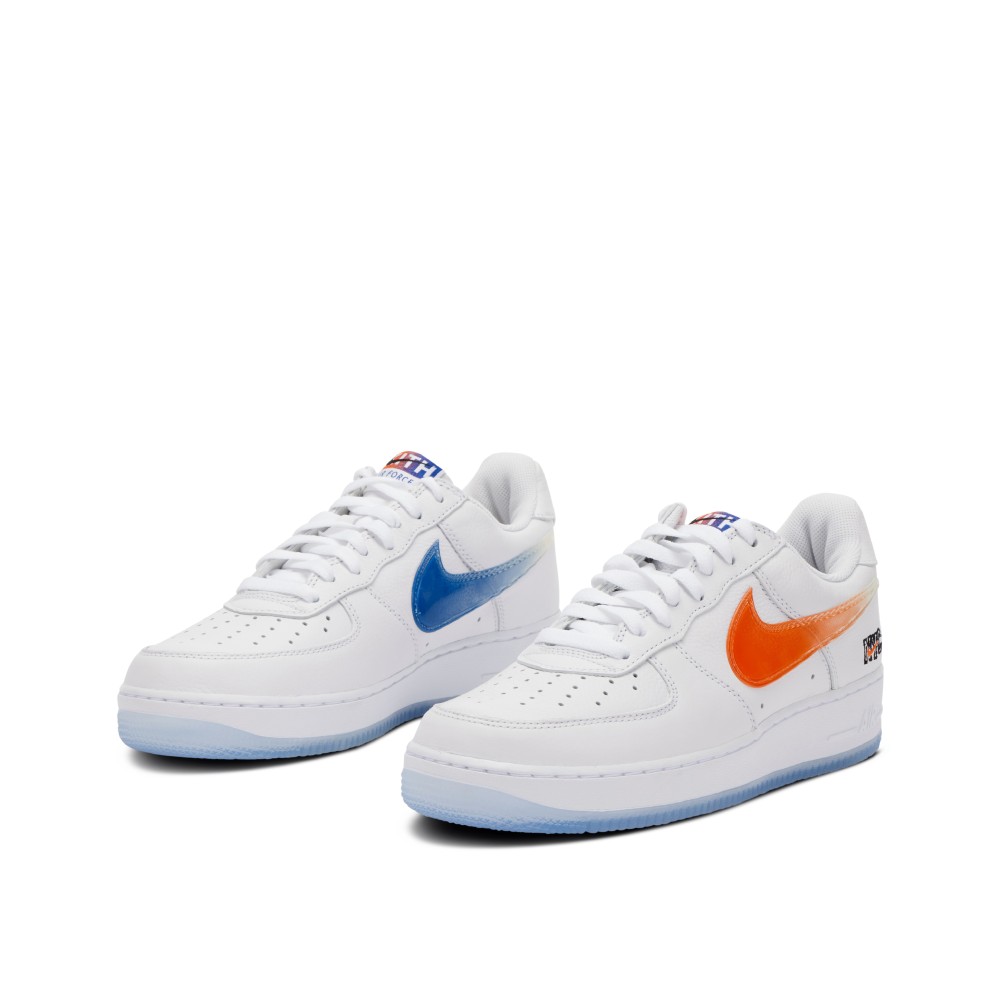 The Nike x Kith Air Force 1 Low “NYC Home” was released in collaboration with Kith, the NYC-based retail store founded by Ronnie Fieg in 2011. The pair was released in 2020 and pulled inspiration from the retailer?s hometown NBA team, the New York Knicks, incorporating a mix of Rush Blue and Brilliant Orange on the classic Air Force 1 low silhouette. The upper consists of white tumbled leather, and mismatched gradient TPU Swooshes in blue and orange. A NYC Swoosh graphic can be found on the lateral heel, along with Kith Air branding embroidered on the heel patch. The design is finished with an icy blue, translucent rubber outsole.