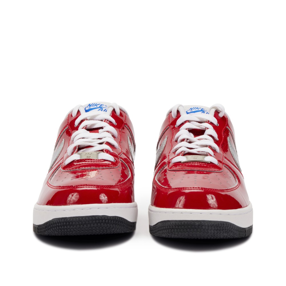 - Upper features red patent leather with metallic silver accents at the heel and Swoosh.
