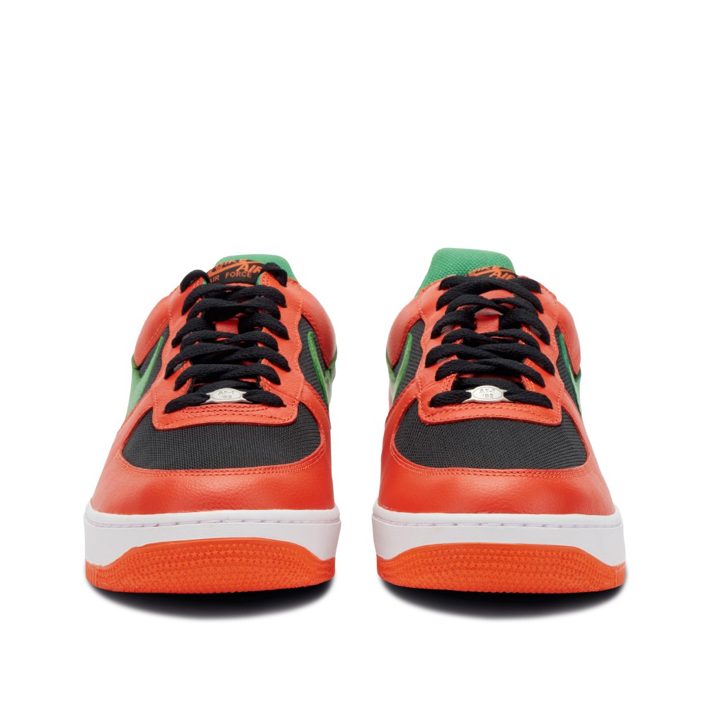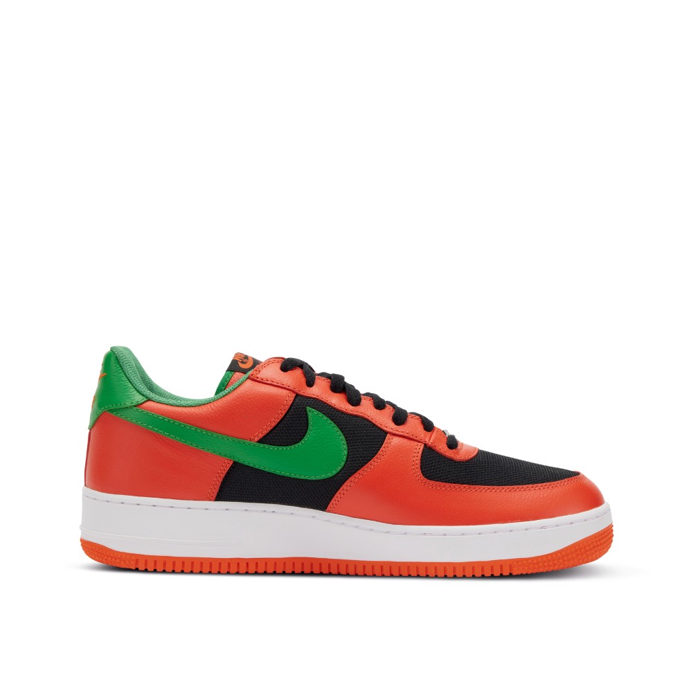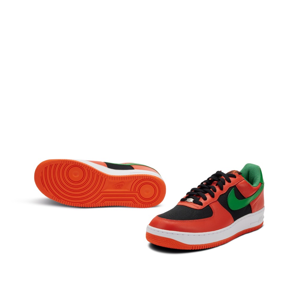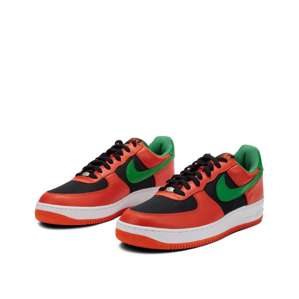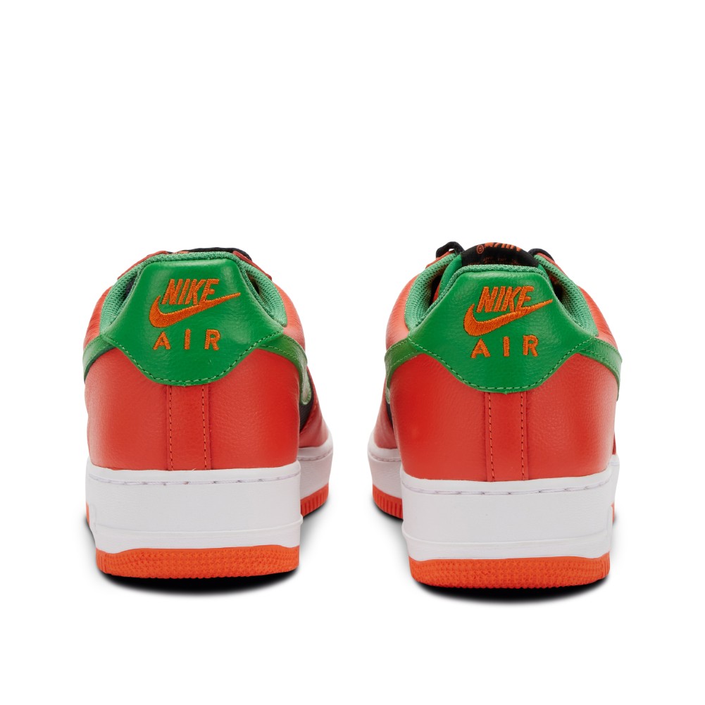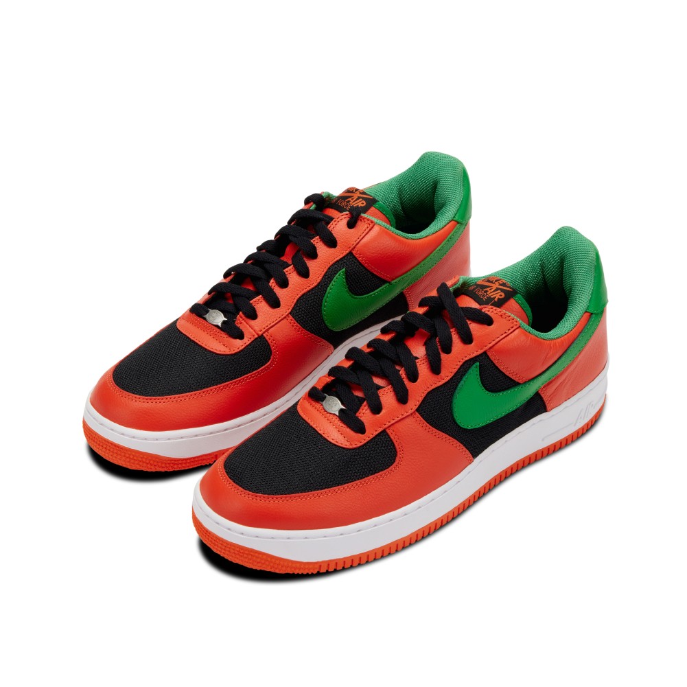 Remaining loyal to the parent design, these feature a similar orange leather outer with black mesh toe box and side strip contrasted with green accents on the Swoosh, back heel and liner. The base of the sneaker is white with orange soles, and finished with black laces and black tongue tag.