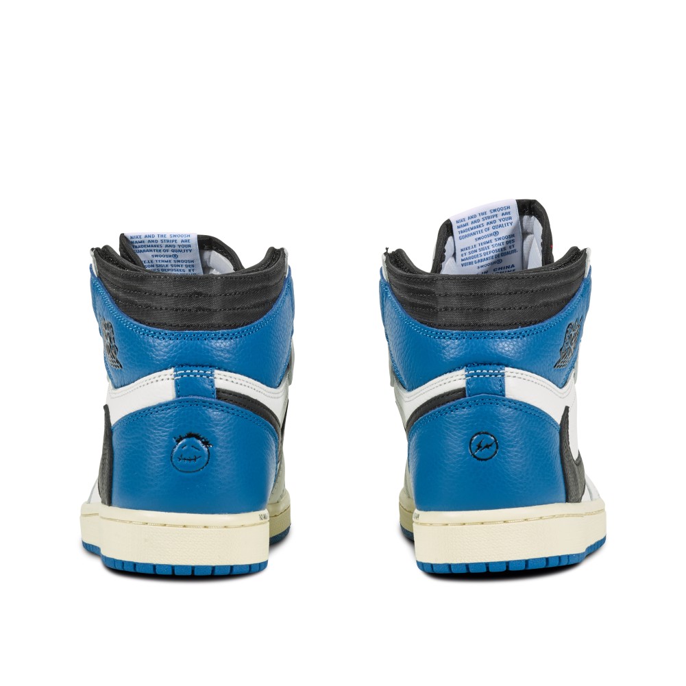 Released in a white and blue upper, similar to famous sample Nike Air Jordan 1s from 1985, this pair?s unique colorblocking and standout reverse Swoosh make these some of the most identifiable pairs of the modern era. Both Fragment Design and Cactus Jack branding are found on the heels and medial midsole. The pair is finished with a sail midsole and blue outsole.