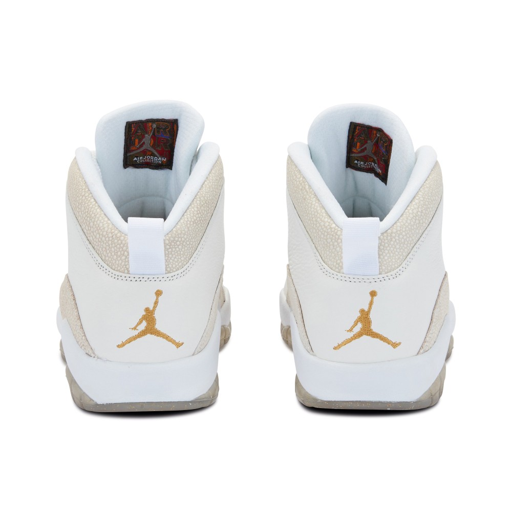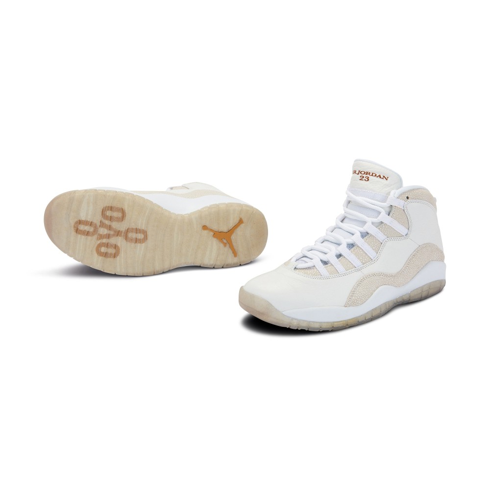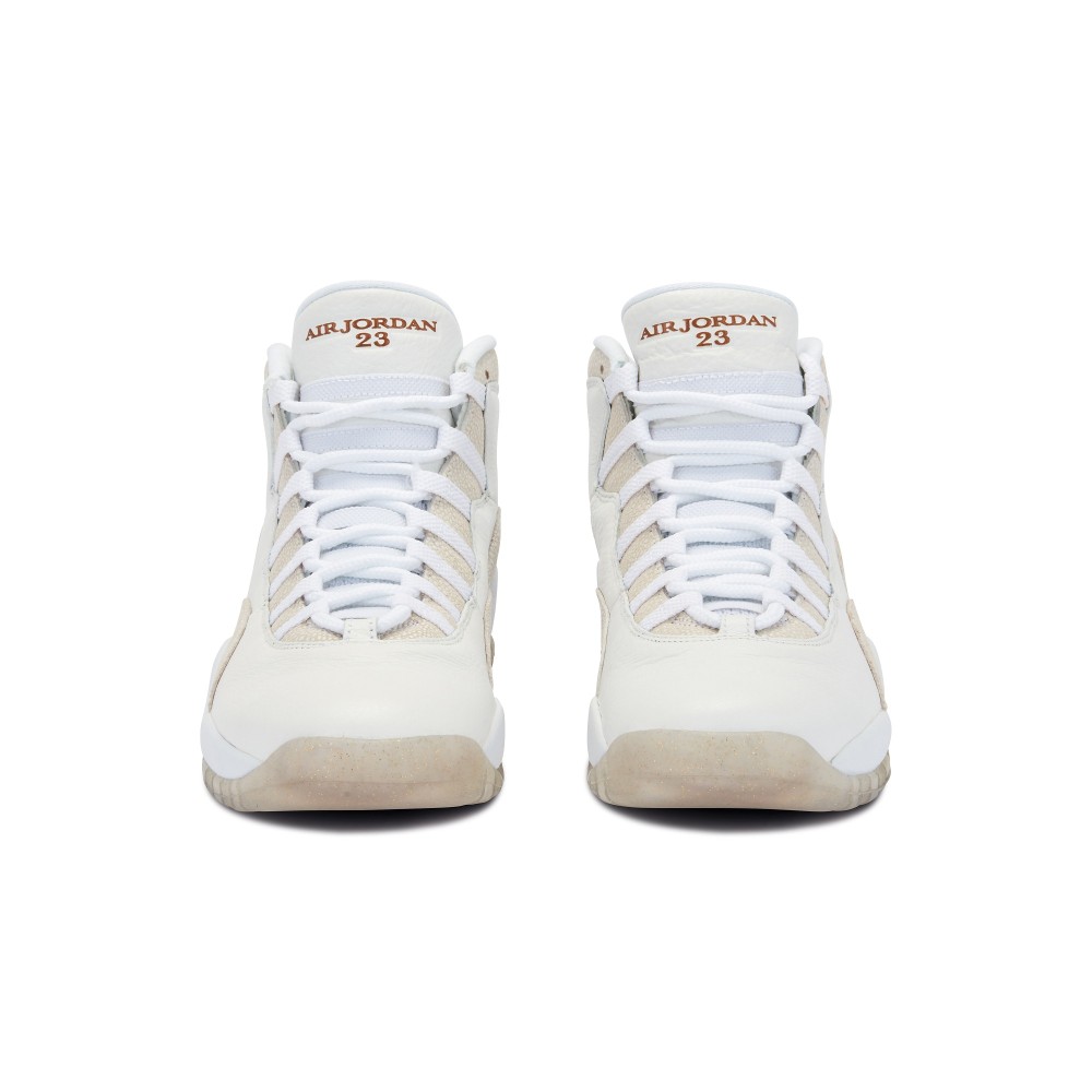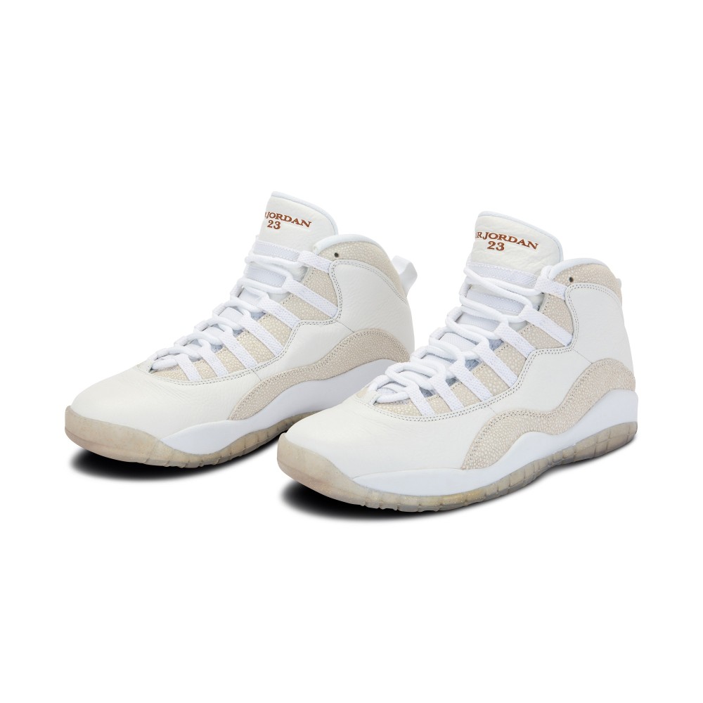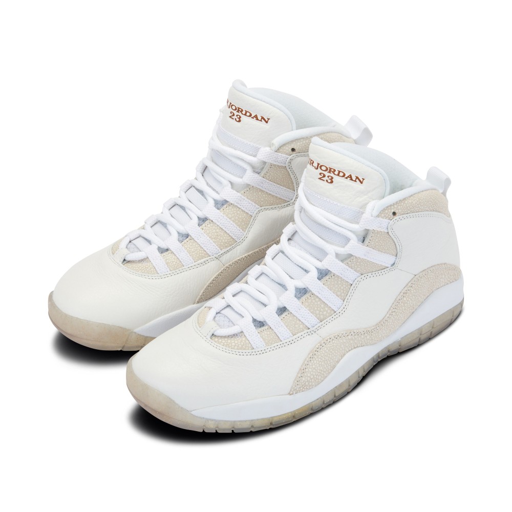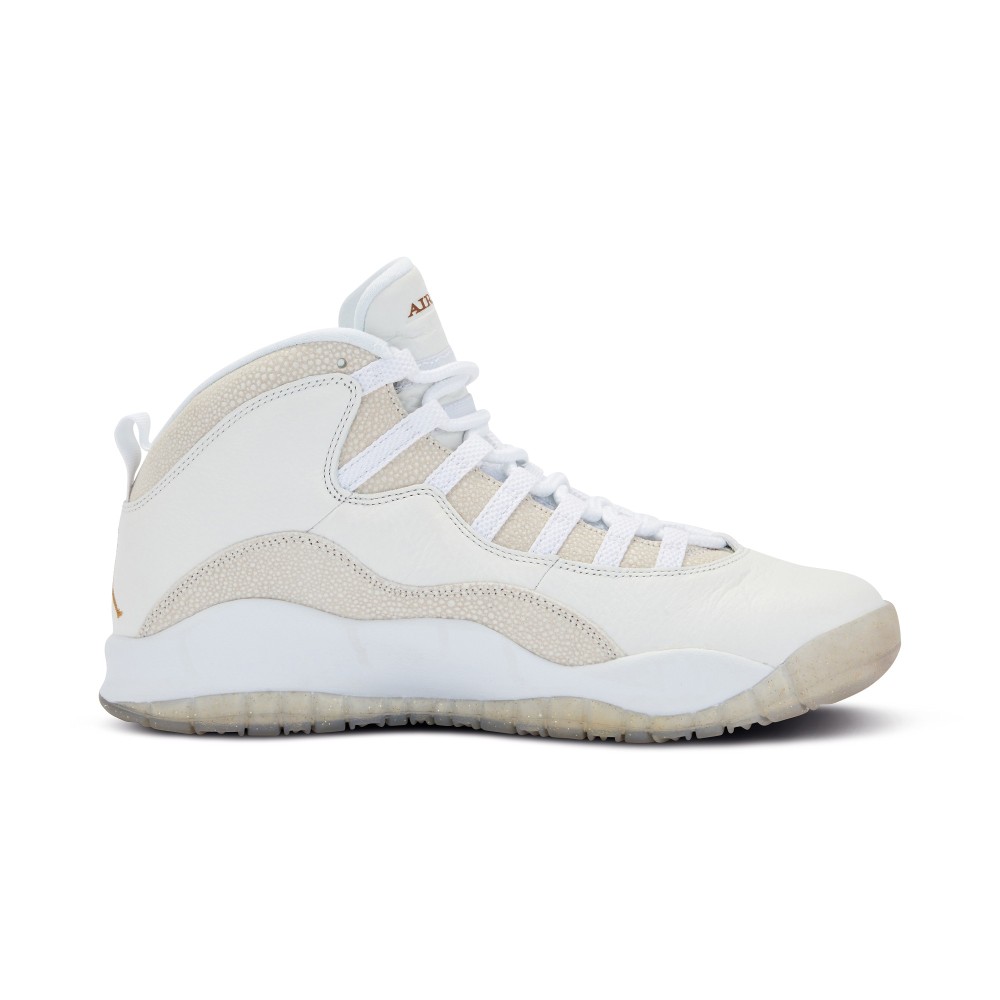 The Air Jordan X, designed by Tinker Hatfield, was originally released in 1994. In 2016, the original Air Jordan X was updated in a collaboration with Drake?s October?s Very Own (?OVO?) label and released during the NBA All-Star weekend. The Air Jordan X Retro OVO features a sleek monochromatic look comprised of premium tumbled off-white leather and faux stingray and a translucent outsole. The shoe features a gold Jumpman logo on the heel and a gold “Jordan 23” on the tongue.
