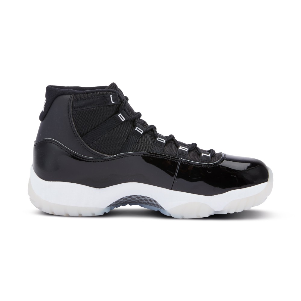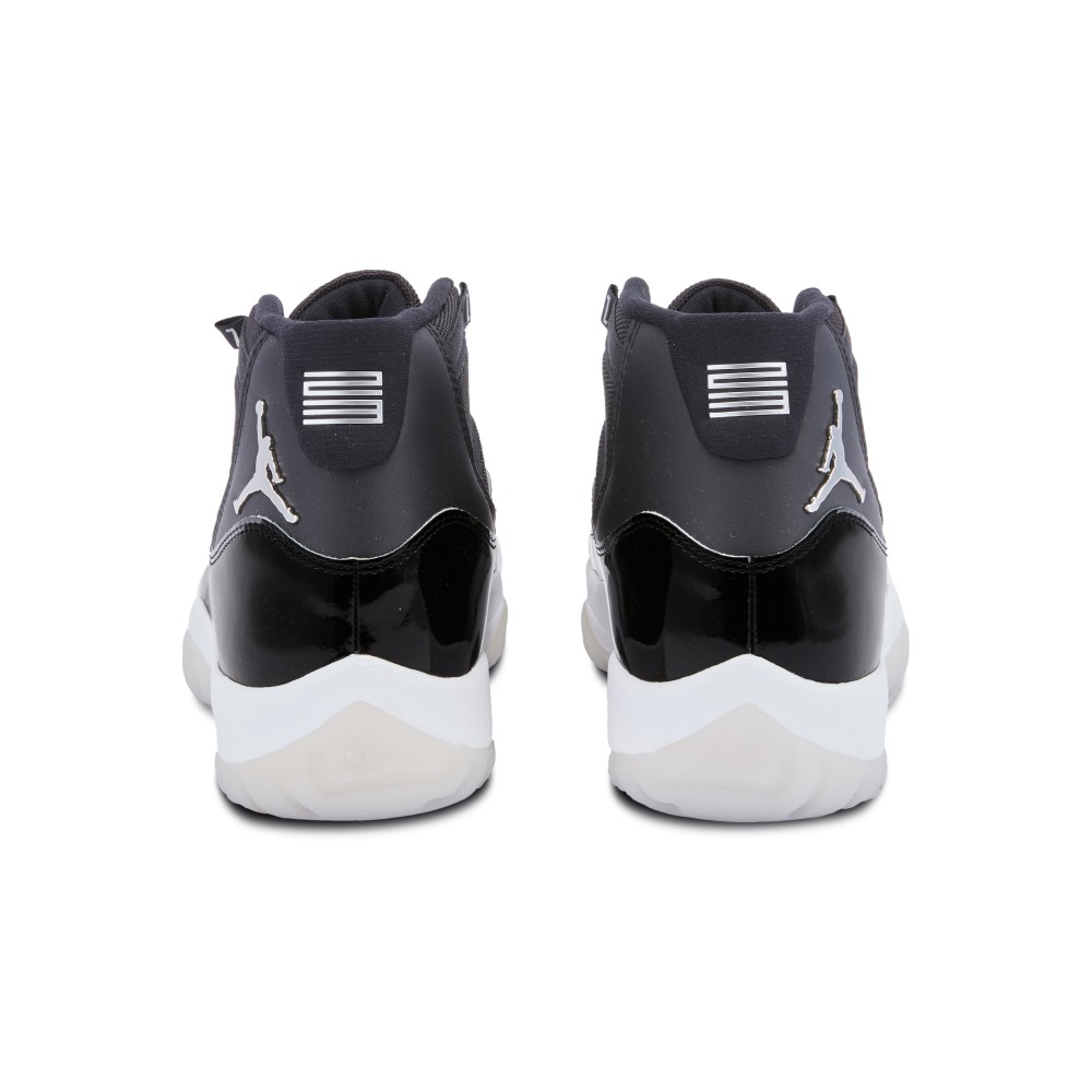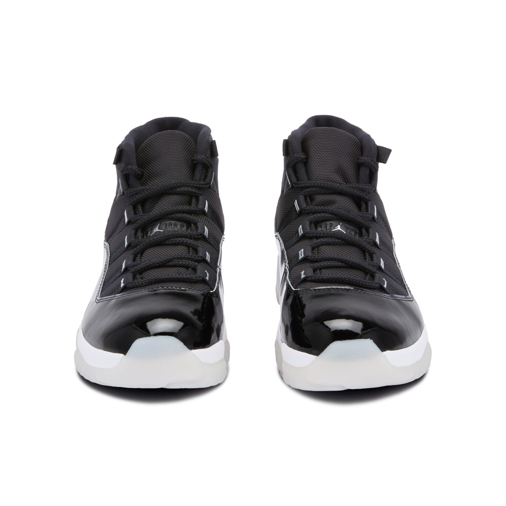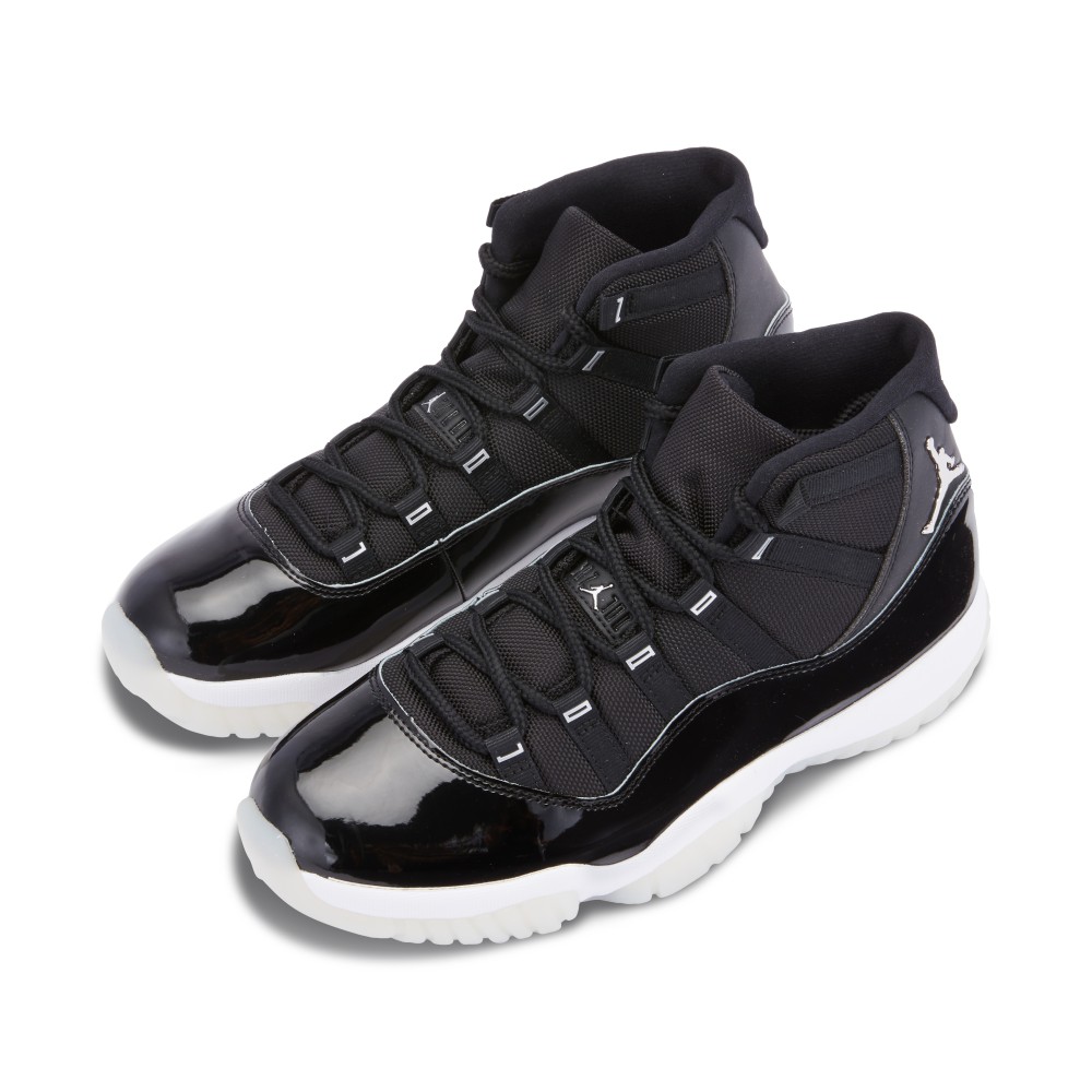 The Air Jordan 11 ?Jubilee? was created to celebrate the silver anniversary of the iconic AJ 11 silhouette, first released in 1995. This style sports a sleek patent leather and ballistic mesh, black upper. The back of the heel features a 3D metallic silver Jumpman and 23. The sneakers’ eyelets are adorned with silver ?JORDAN? lettering. A Jumpman can also be found on the inside of the tongue and sole of the shoe. The shoe sits on a white foam midsole above a translucent, ridged outsole.