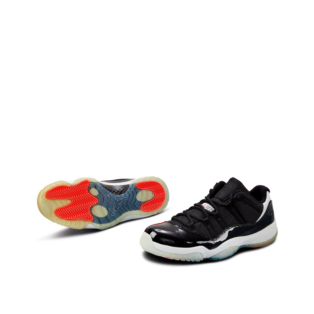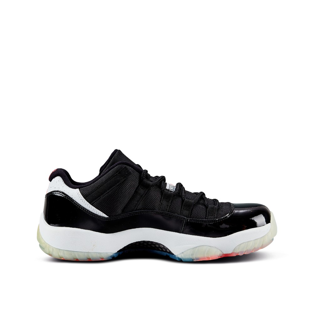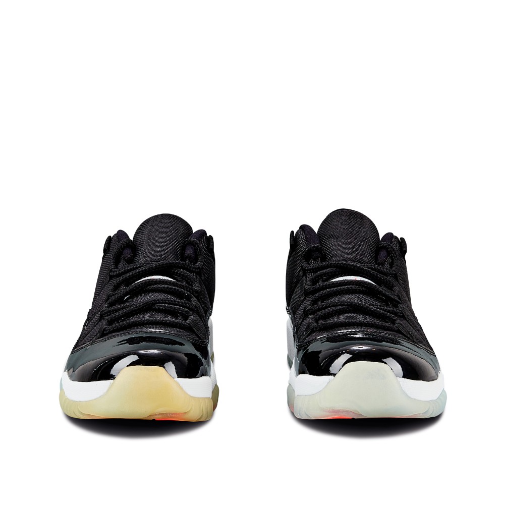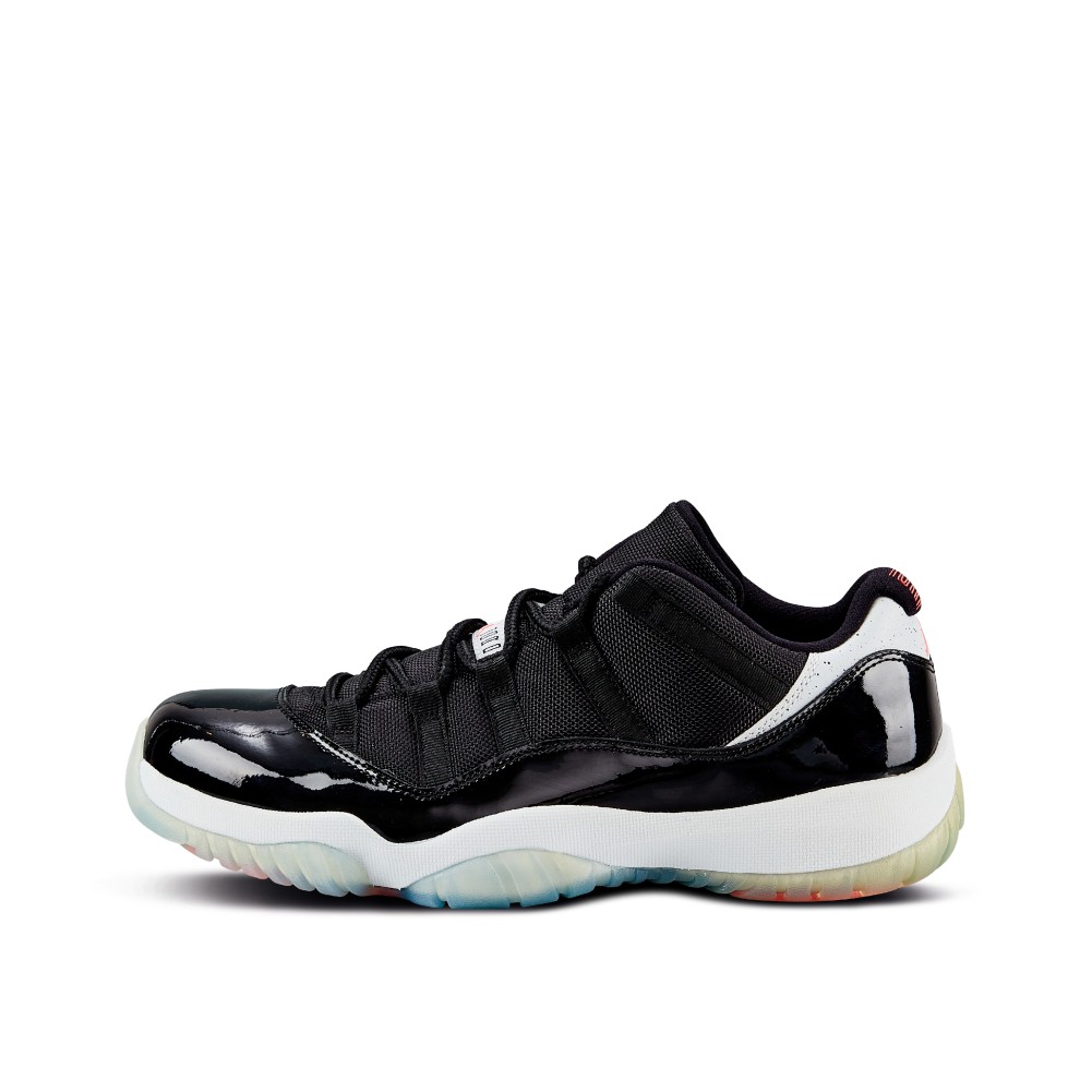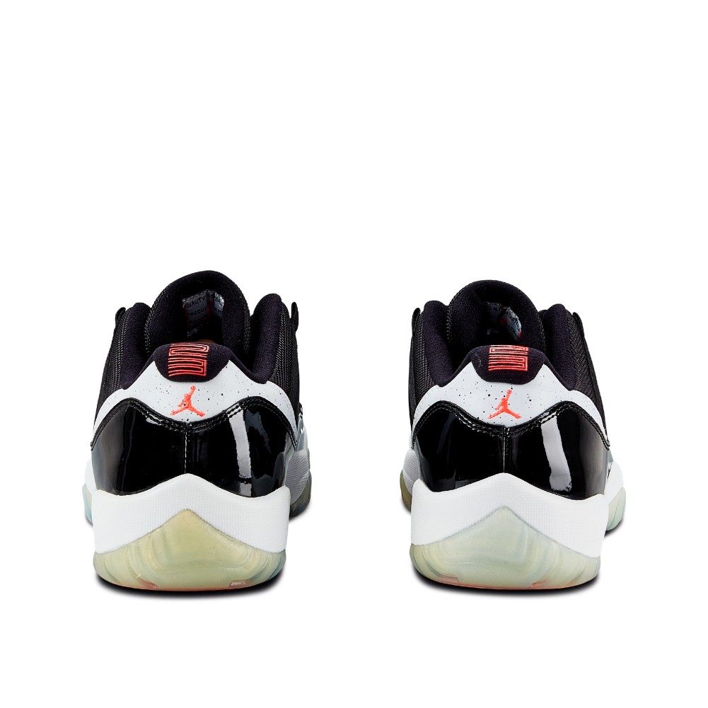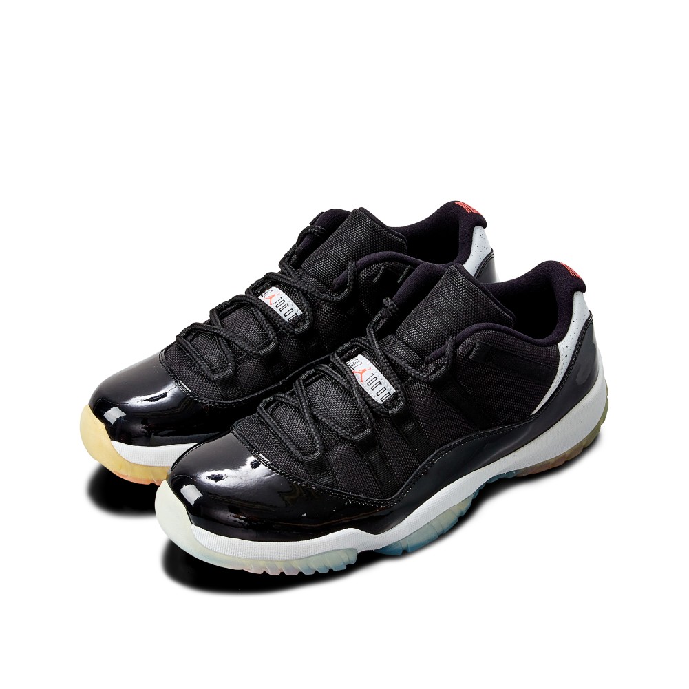 While the standard cut of the AJ11 was a high top, in the 1996 NBA Finals, Jordan was spotted wearing a black and red, low-cut version of the patent leather sneaker. In 2001, during the first run of retros for the Air Jordan 11, the brand introduced the Air Jordan XI low with the patent leather for the first time. Dressed in a predominantly black upper atop a white midsole, the Air Jordan 11 Retro “Infrared 23” features speckled detailing accents on the heel overlay. Complete with infrared accents on the branding, the herringbone pattern on the outsole is also featured in infrared.