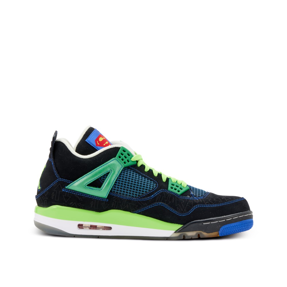 The Superman-themed design consists of a black nubuck upper, with bright green and blue accents on the midsole, branding and eyestay. Additionally, the tongue features the Superman ?S? logo and a silhouette of Isaiah?s face is accented on the heel. The Air Jordan 4 (IV) is one of the most popular models in the Air Jordan lineage. First debuted at the 1989 NBA All-Star Game, and designed by Nike legend Tinker Hatfield, it was the first global release for the Jordan Brand.