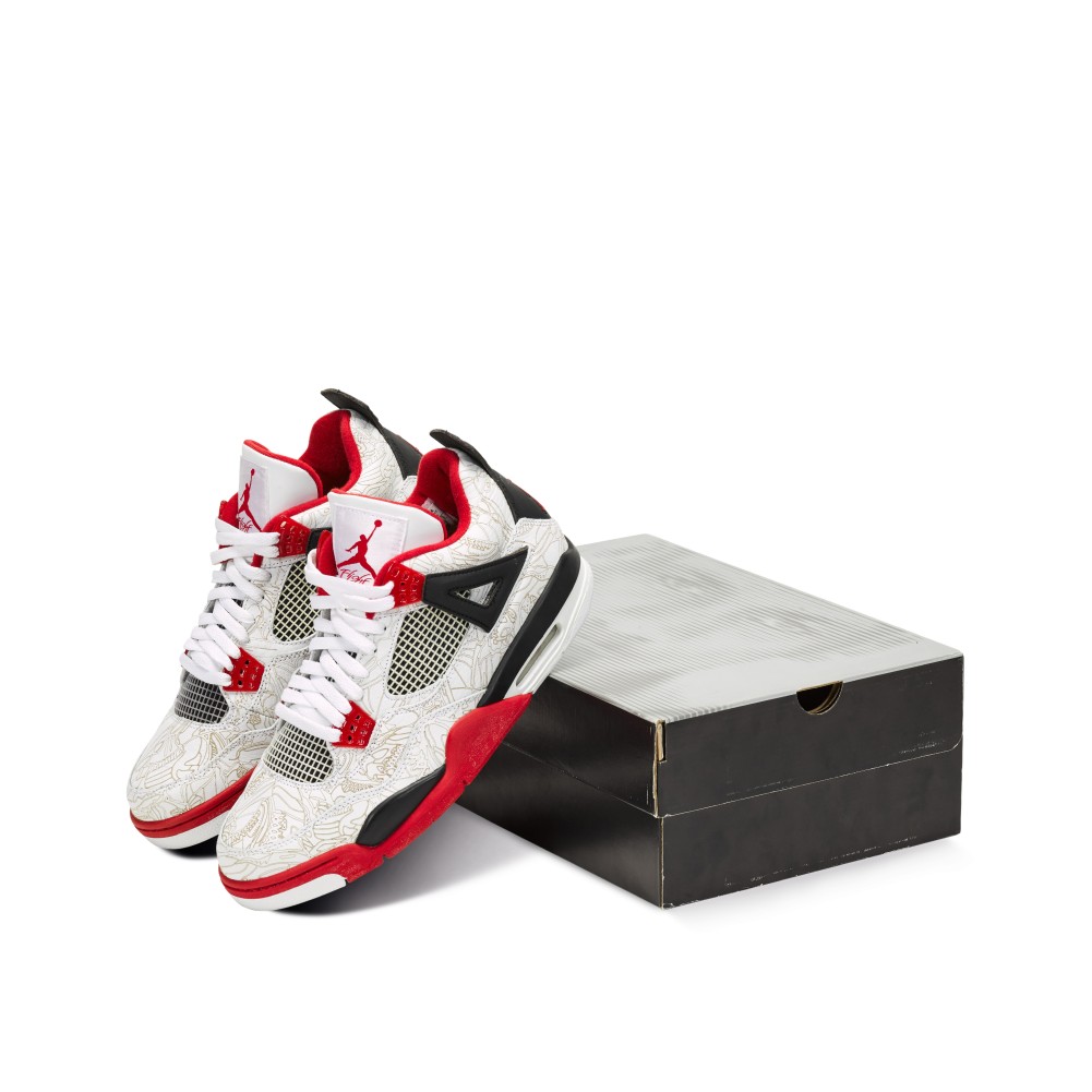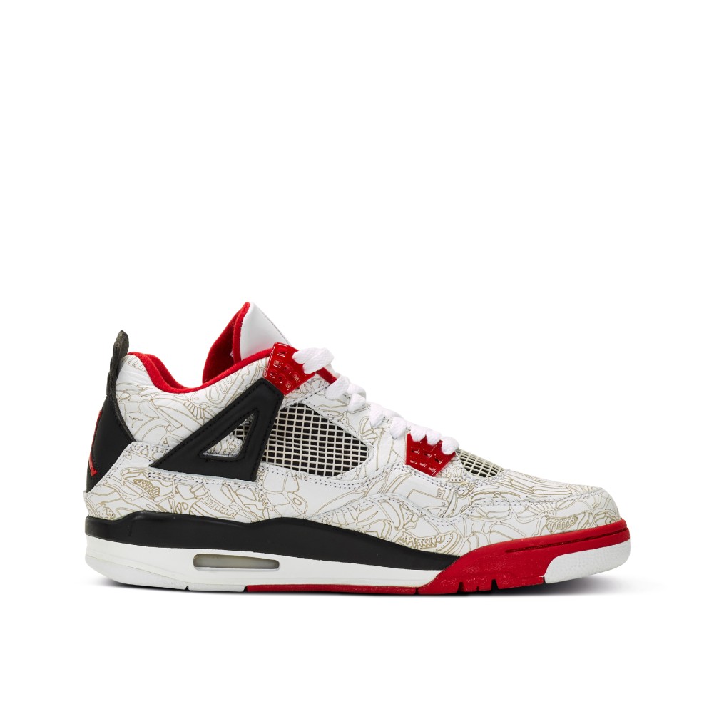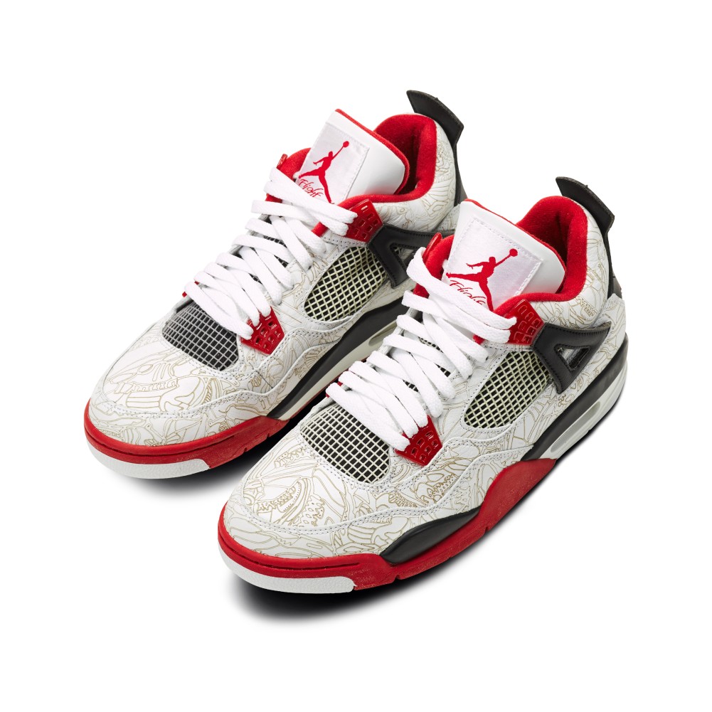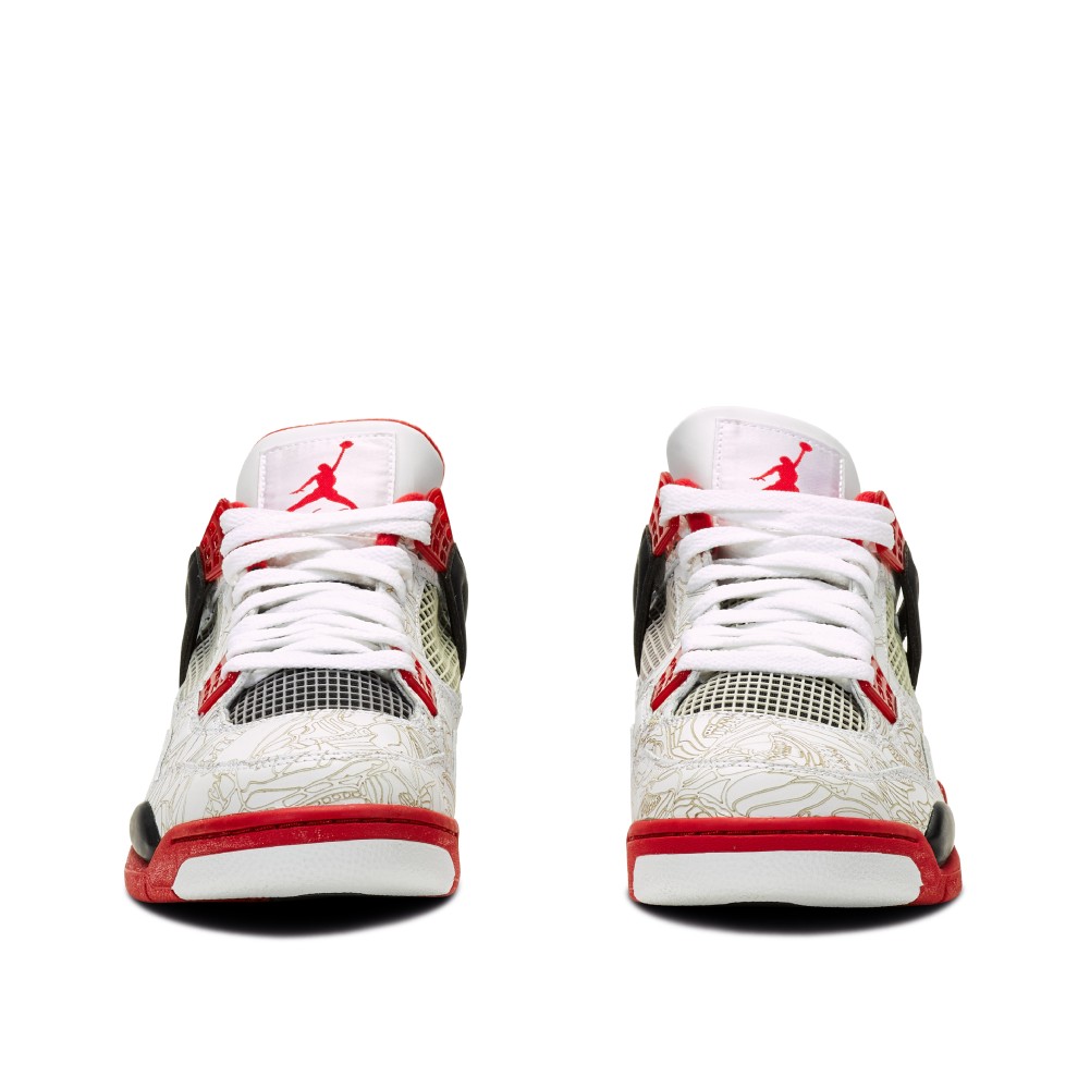 Borrowing an upper from the Air Jordan 4 Fire Red colorway, this pair features a white leather upper, black wings, midsole and heel tab, and a red outsole and lining. Dropping in 2005, the Jordan brand utilized Nike?s famous laser-design technology on the white leather upper, intricately designing various Air Jordan models. To add to the original design, the wings were made of leather instead of rubber, and the heel tab had the Jumpman logo instead of Nike Air.