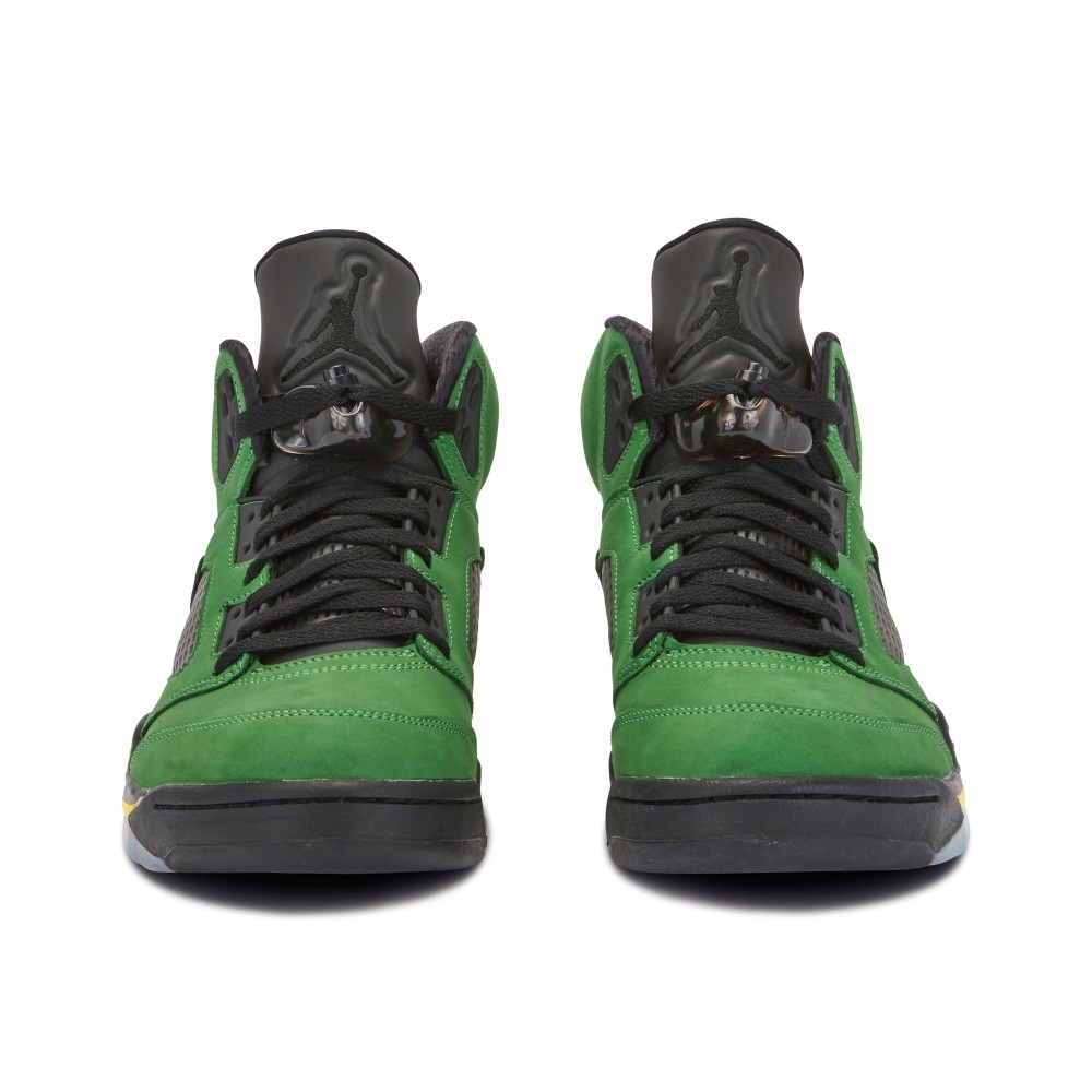 The Air Jordan V Retro SE “Oregon” features the University of Oregon colorway with Apple Green uppers and contrasting black eyelets, tongues and mesh inserts. The midsole is accented in Yellow Strike and a signature shark-tooth detailing. University of Oregon and Nike have a historic bond, as the company was founded by former “Oregon Ducks” track athlete Phil Knight and coach Bill Bowerman. University of Oregon students and alumni have benefited greatly from Knight’s continuous generosity towards both academic and athletic programs.