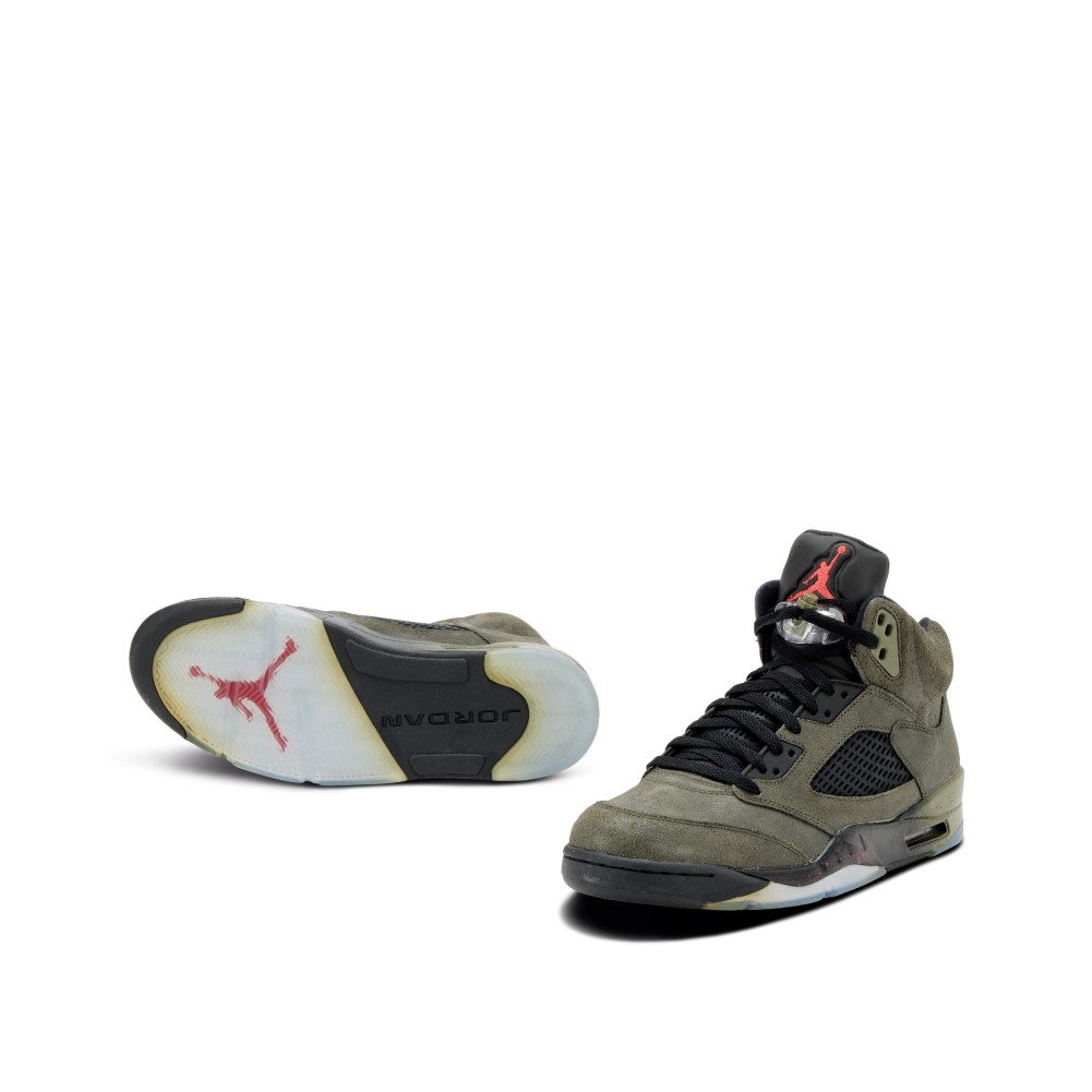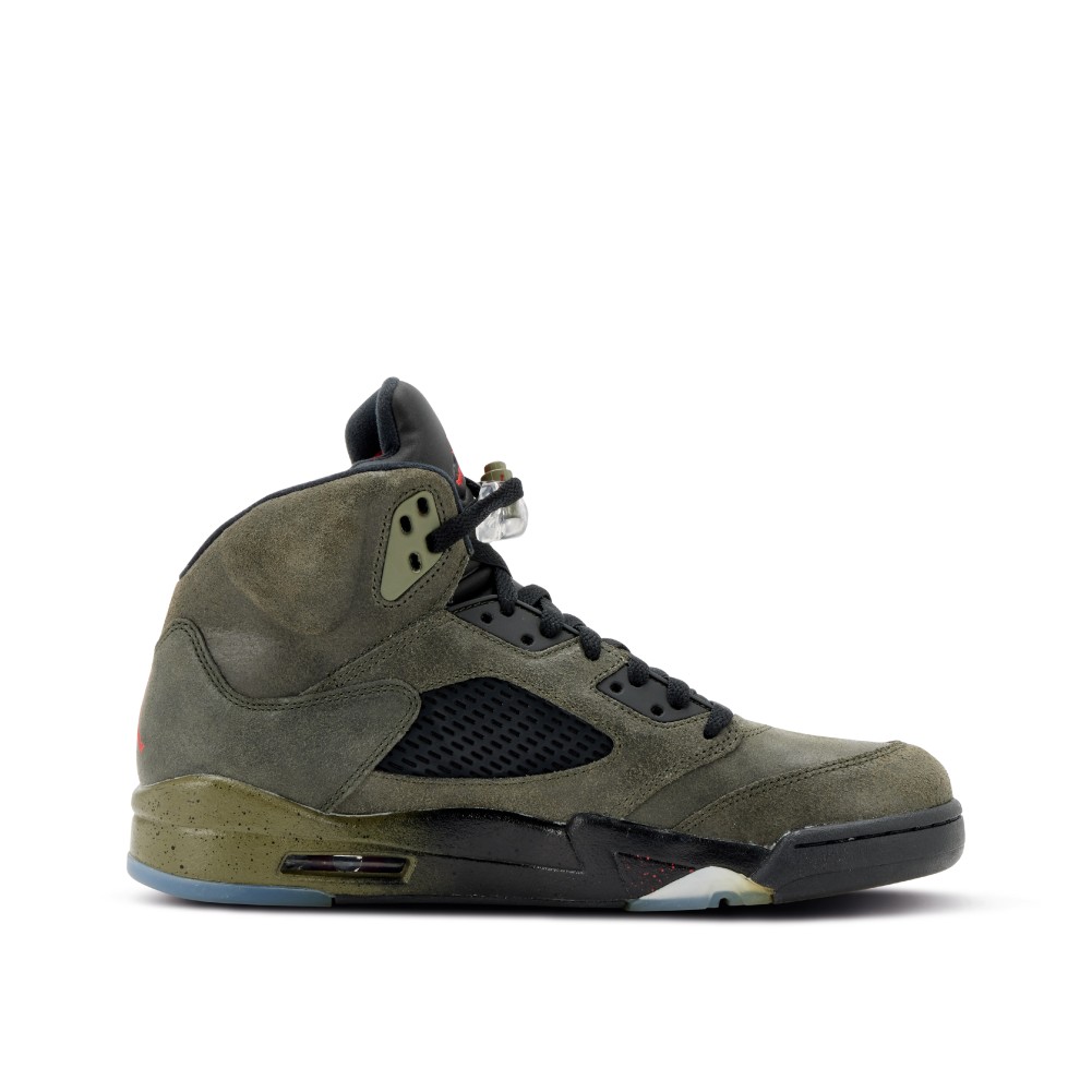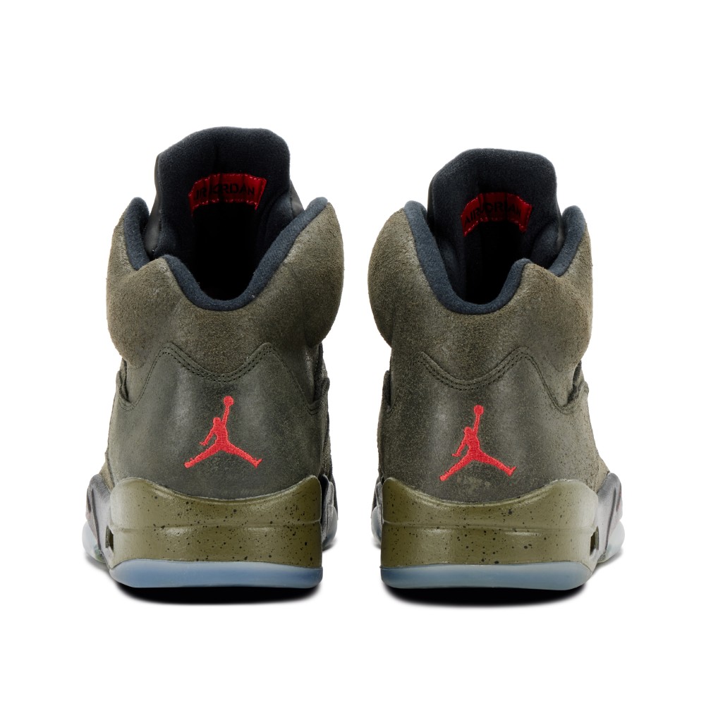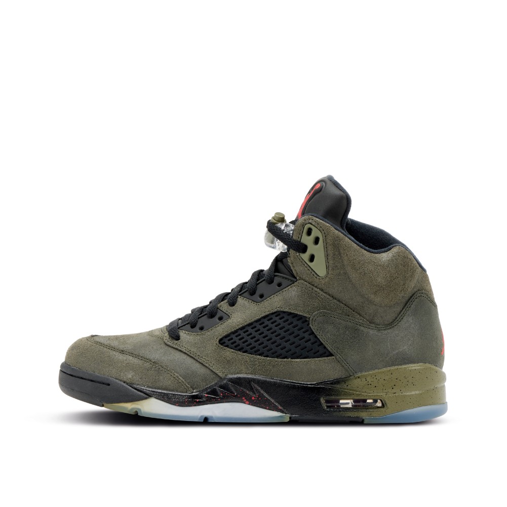 Released in 2013 alongside an Air Jordan 3 and Air Jordan 4, this Air Jordan 5 Retro completed the “Fear Pack.” The neutral suede upper is finished in a blend of Medium Olive and Sequoia. The signature Air Jordan 5 shark-tooth detailing is represented in Olive with Fire Red speckling, and contrasted with an icy blue outsole. As branded on the insole, the “Fear Pack” was inspired by a Jordan Brand commercial narrated by Michael Jordan himself, which featured the line “I?m scared of what I won?t become, and you?re scared of what I could become.”