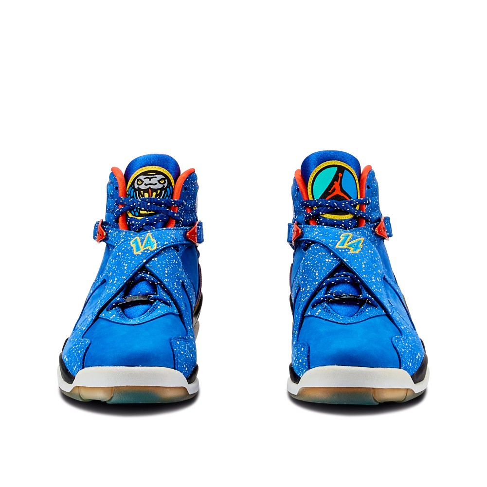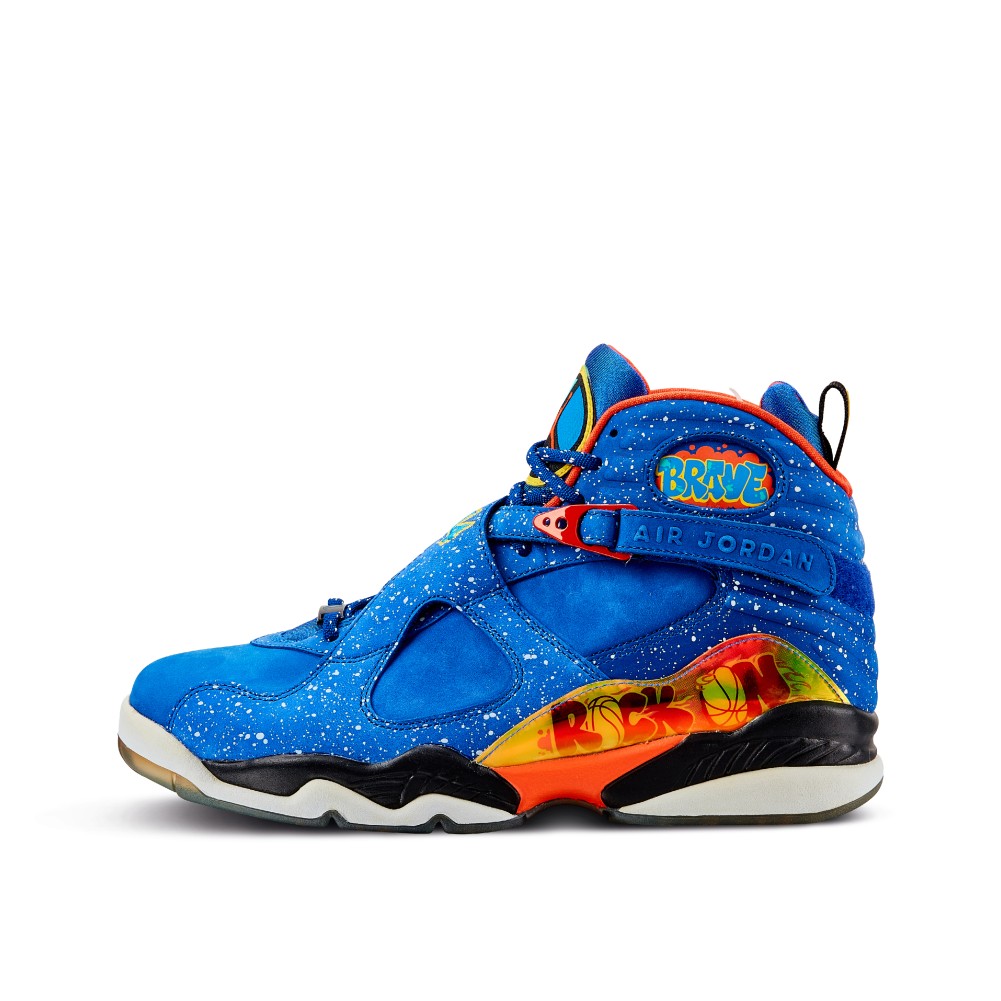 The Nike Air Jordan 8 Retro DB ?Doernbecher? was released in 2014. This pair is part of the 11th Doernbecher Freestyle Collection, a series that features designs by patients of Doernbecher Children?s Hospital. This pair was designed by Caden Lambert, who was diagnosed with Guillain-Barr? syndrome, a life-threatening autoimmune disease. The vibrant sneaker features a Hyper Blue speckled upper with accents of orange, black and yellow. The pair highlights Caden?s personal details throughout like his basketball jersey #14 on the custom glow-in-the-dark upper and his brothers’ names Blake and Ryland on the footstraps. A boombox is stamped on the inside of one of the tongues to share his love of music while the other bears the name of his brother Ryland who battled childhood cancer. The Doernbecher Freestyle Collection reflects the strength and inspiration of the six young patient-designers.