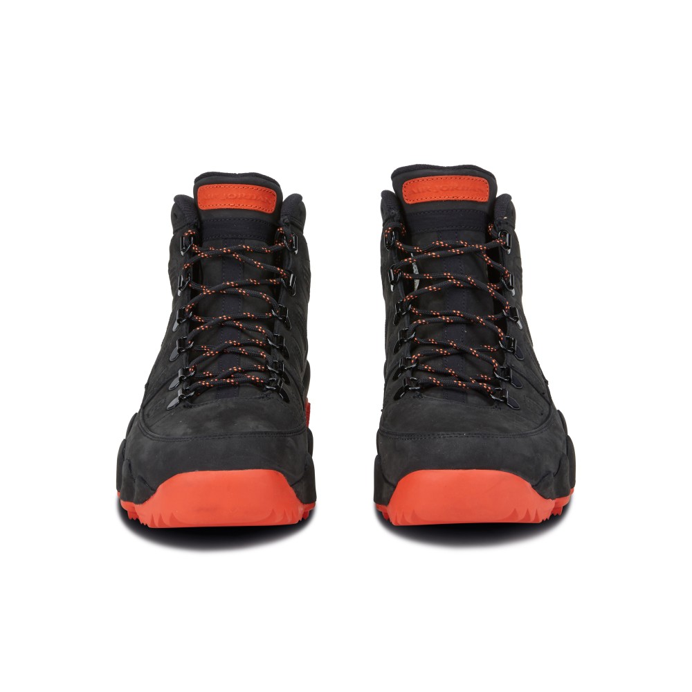 - Black weather-resistant leather upper with orange outsole.