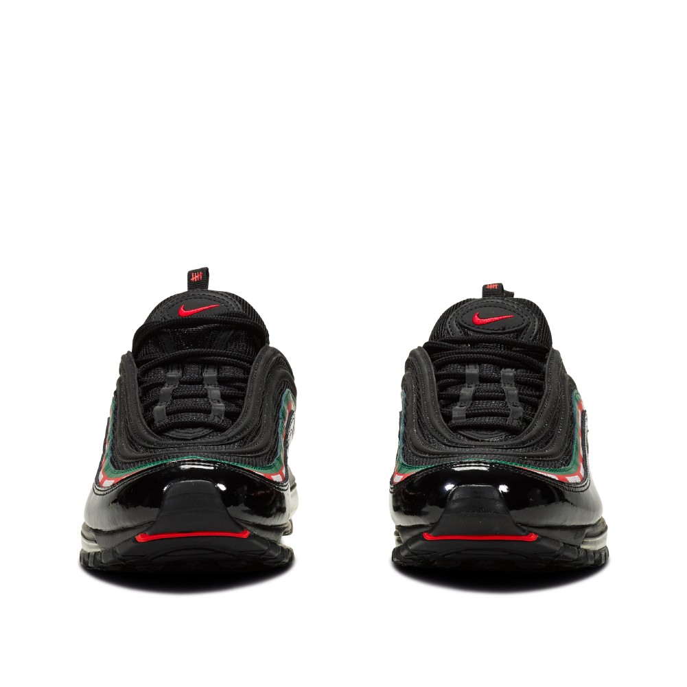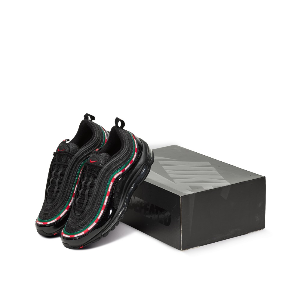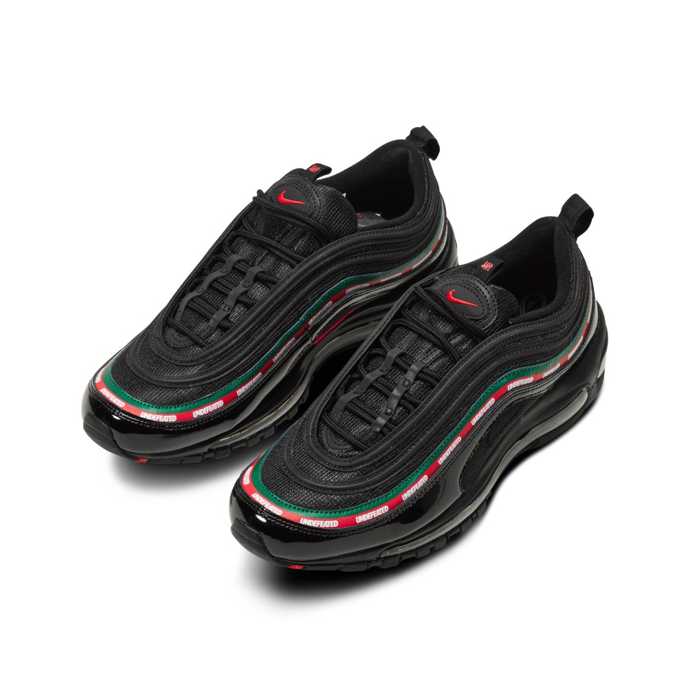 Coinciding with both the 20th anniversary of the Nike Air Max 97, as well as the Los Angeles boutique Undefeated?s 15th anniversary, both brands collaborated for a commemorative Air Max 97. The iconic Air Max 97 silhouette is kept the same and the subtle branding is what makes these Undefeated designs stand out. With a Gorge Green and Speed Red wavy panel stripe contrasting against the mix of black fabric and patent leather, this pair does not depart from a conventional Air Max 97. There is unique Undefeated branding on both the insoles, tongues, as well as alongside the colorful stripe. Released alongside a lighter colorway, the black Air Max 97 x Undefeated truly pays homage to the original design which has made it so famous.
