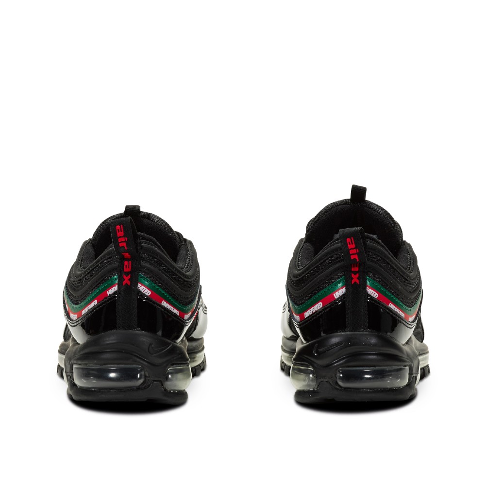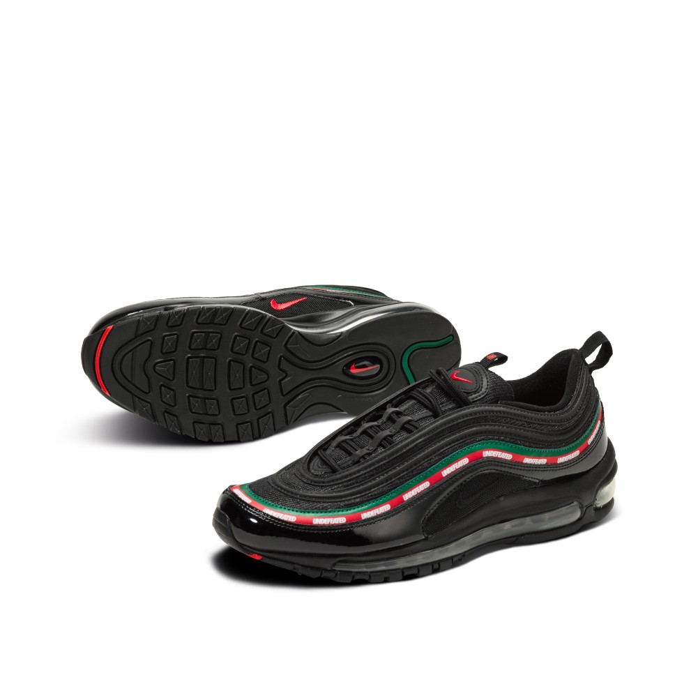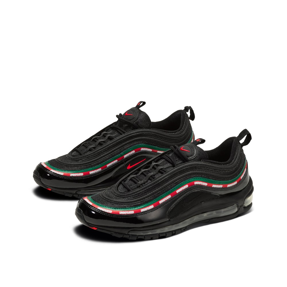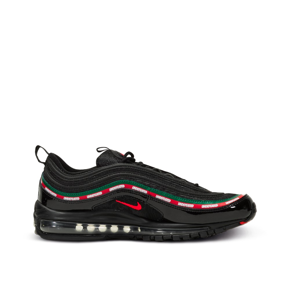 Coinciding with both the 20th anniversary of the Nike Air Max 97, as well as the Los Angeles boutique Undefeated?s 15th anniversary, both brands collaborated for a commemorative Air Max 97. The iconic Air Max 97 silhouette is kept the same and the subtle branding is what makes these Undefeated designs stand out. With a Gorge Green and Speed Red wavy panel stripe contrasting against the mix of black fabric and patent leather, this pair does not depart from a conventional Air Max 97. There is unique Undefeated branding on both the insoles, tongues, as well as alongside the colorful stripe. Released alongside a lighter colorway, the black Air Max 97 x Undefeated truly pays homage to the original design which has made it so famous.