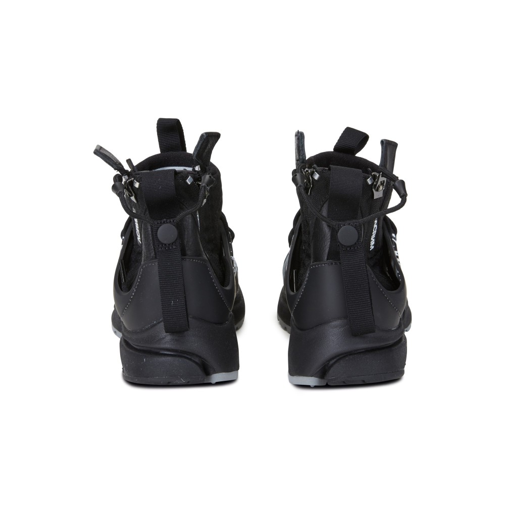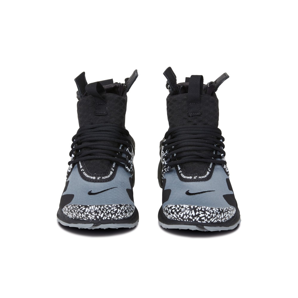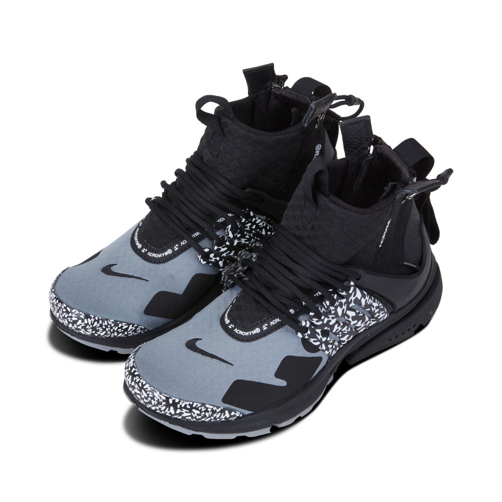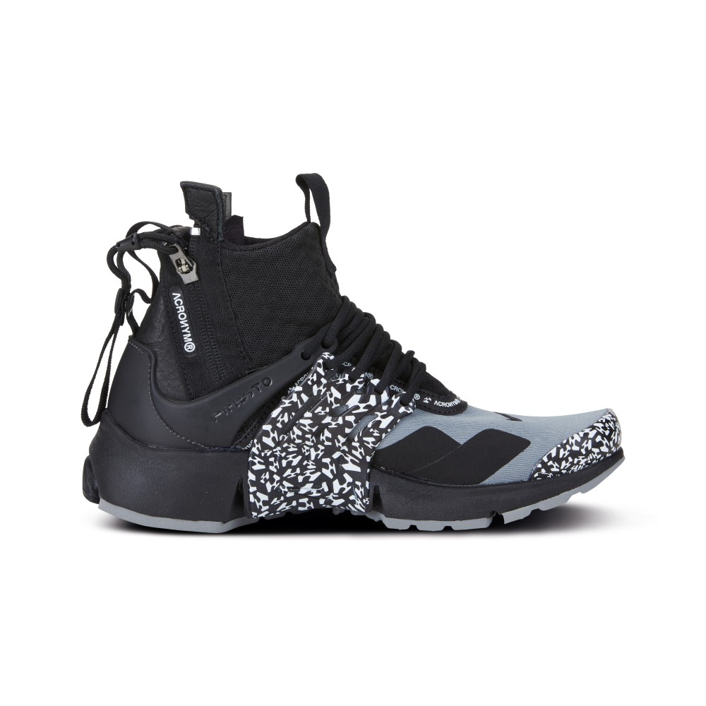 Errolson Hugh, co-founder of the fashion brand Acronym, partnered with Nike to create an unconventional version of the Nike Air Presto. Staying true to his roots, Hugh worked with Nike to create a highly functional and innovative design. One of three colorways released, this cool grey version features a solid grey and black upper, with a black and white splatter print lace cage and toe overlay. The lace textured inner bootie is adorned with functioning side wall zippers with a branded Acronym tag. This sneaker was released in September of 2018.