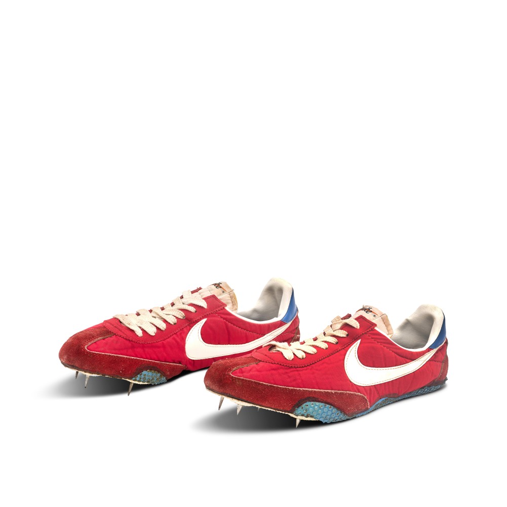 - A mid ?70s model of the Americas in red “Swoosh Fiber” nylon and suede uppers, white Swoosh logo, and blue heel tab with bold Nike lettering.