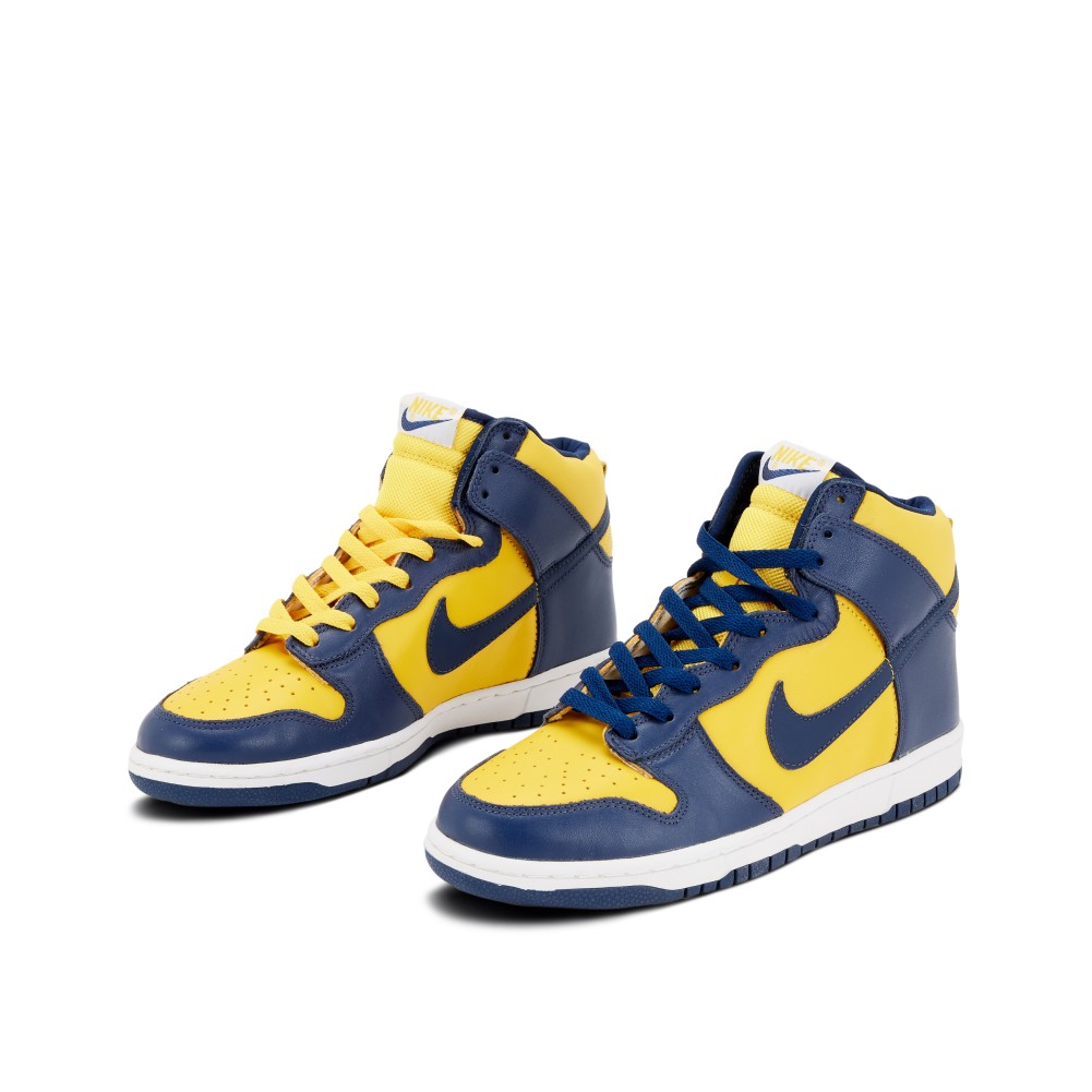 The Nike Dunk High “Michigan” features a simple, two-tone colorway in yellow and navy, paying homage to the University of Michigan?s team colors. Originally released in 1985, Nike introduced the Nike Dunk as the premier basketball sneaker in college basketball. The colorways for the series were based on successful programs around the nation. Kentucky, Michigan, UNLV, Syracuse, St. John?s, Villanova and Iowa all received their own signature shoe.
