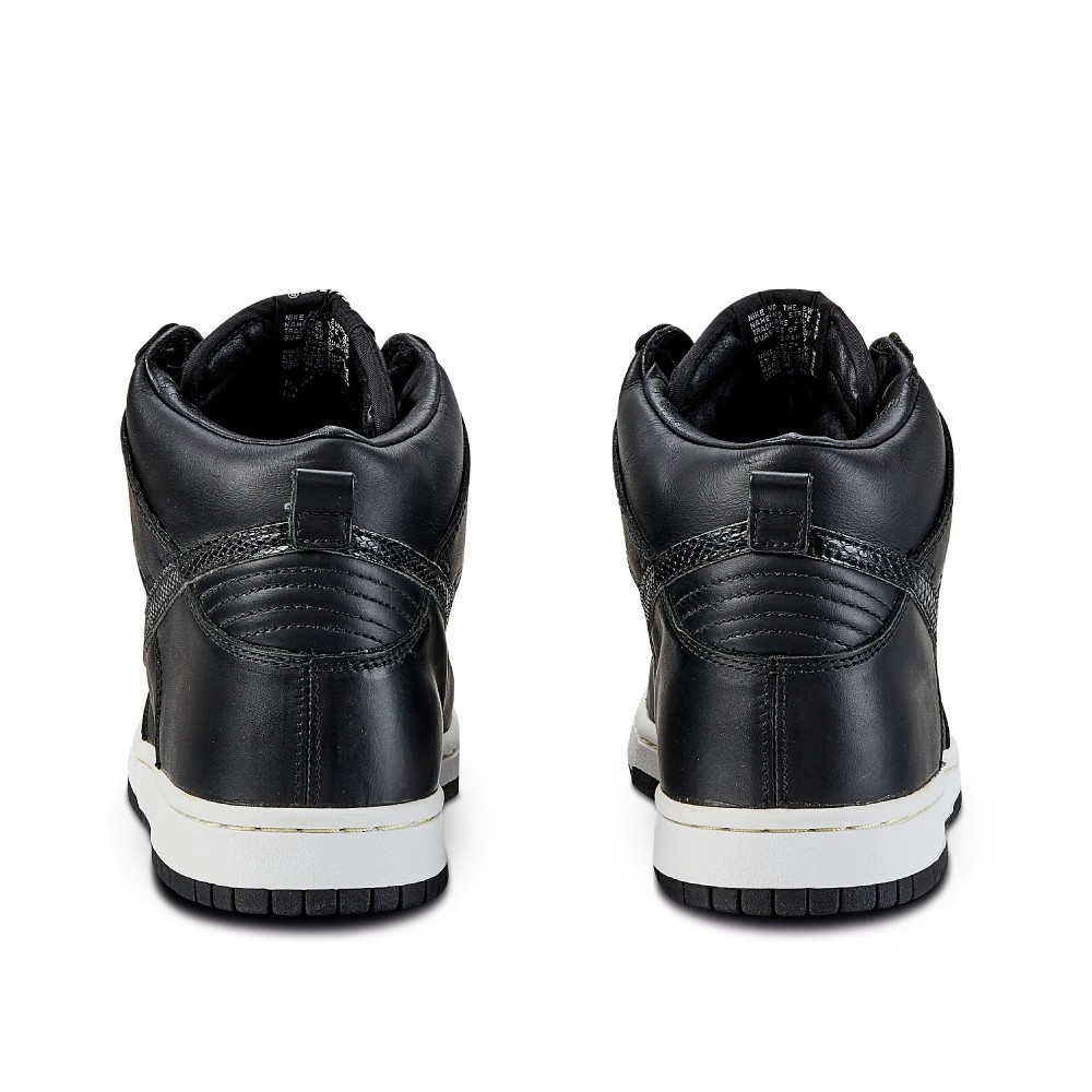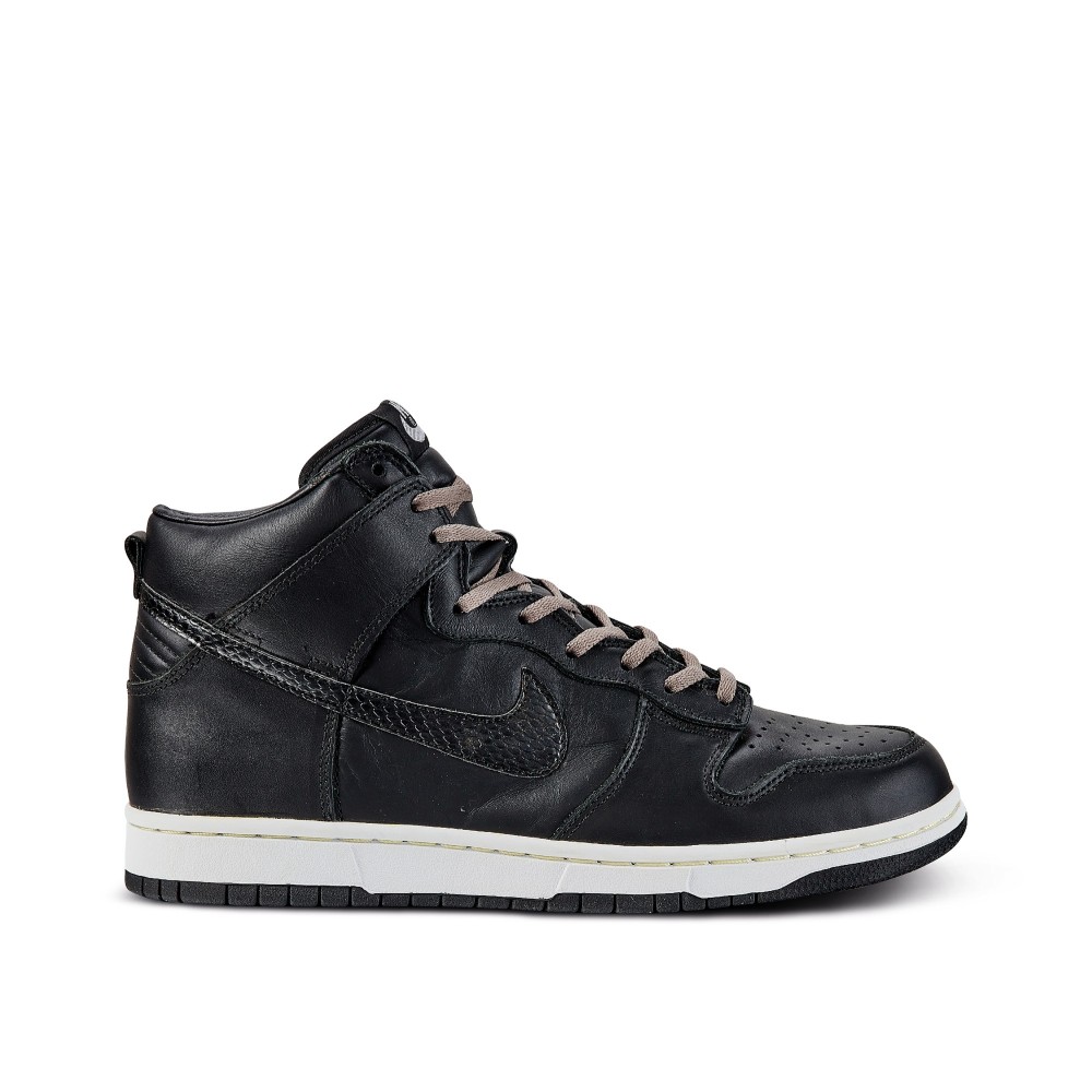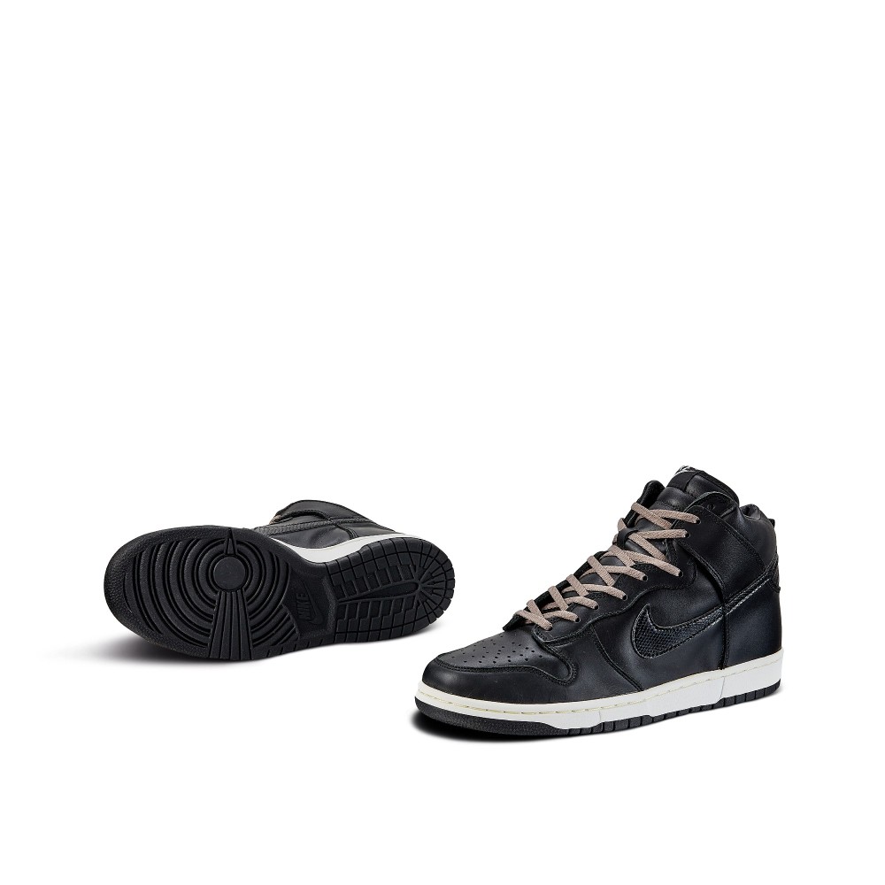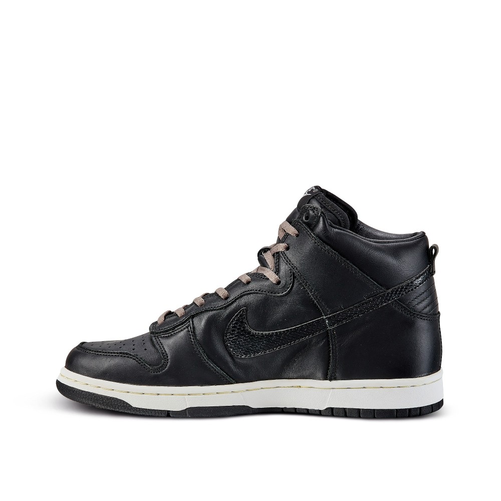 The shoe features a black leather upper with snakeskin swooshes. The Nike Dunk Hi Plus B ?St?ssy? is the first shoe to incorporate specialty fabrics on the swoosh, sparking a design choice we see in many silhouettes today. The sneaker rests on a white midsole with a black outsole and comes with fossil gray shoelaces.