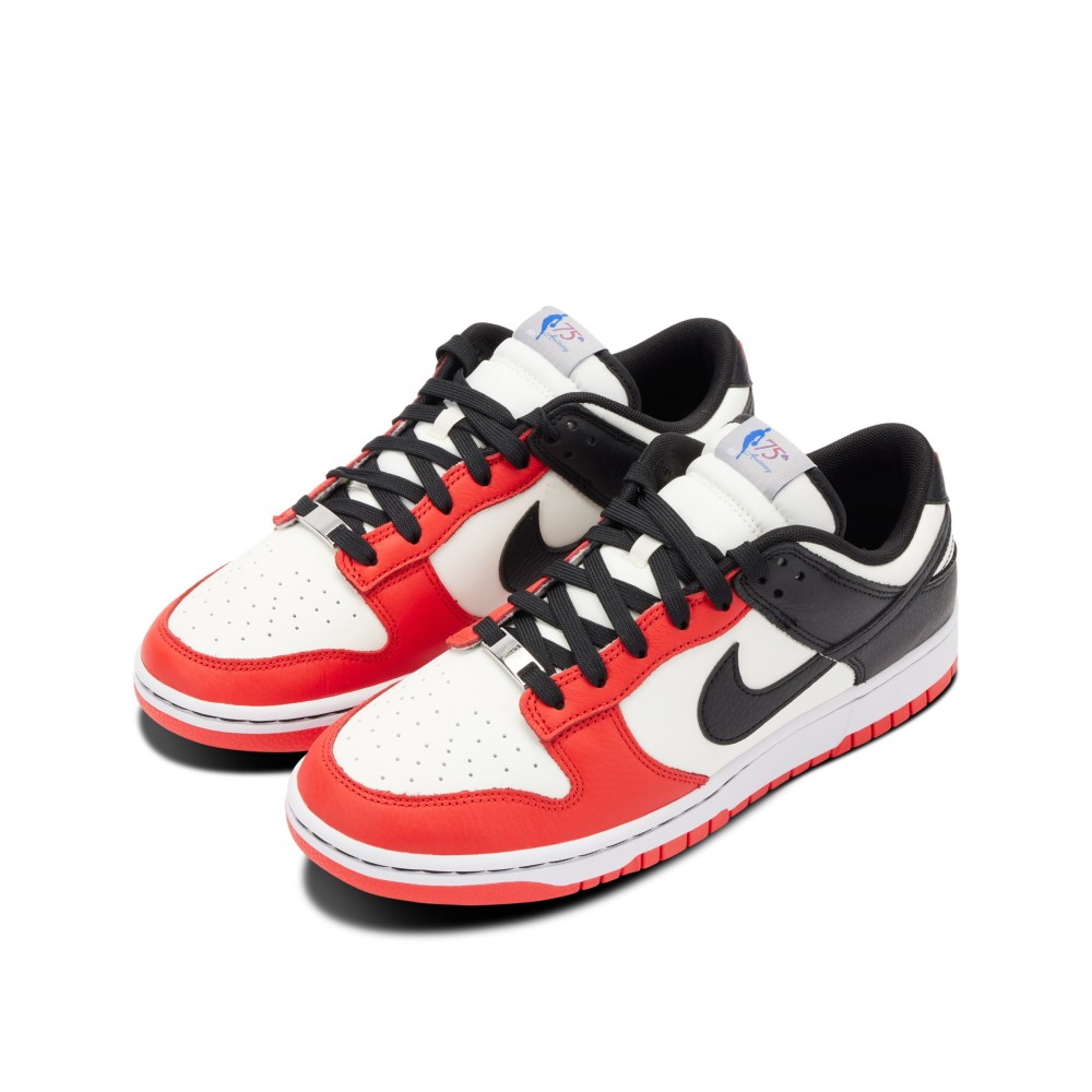 In celebration of the 75th anniversary of the NBA, Nike created three team-themed colorways in the Dunk Low silhouette for the occasion. Offered here is the Chicago Bulls-themed Nike Dunk Low. complete in a White base with Black paneling and Chile Red outsole. The tongue tags feature a unique imagery of Jerry West and ?75 Anniversary? text. A diamond is etched on the silver lace deubr? as the 75 years is often referred to as a diamond jubilee.