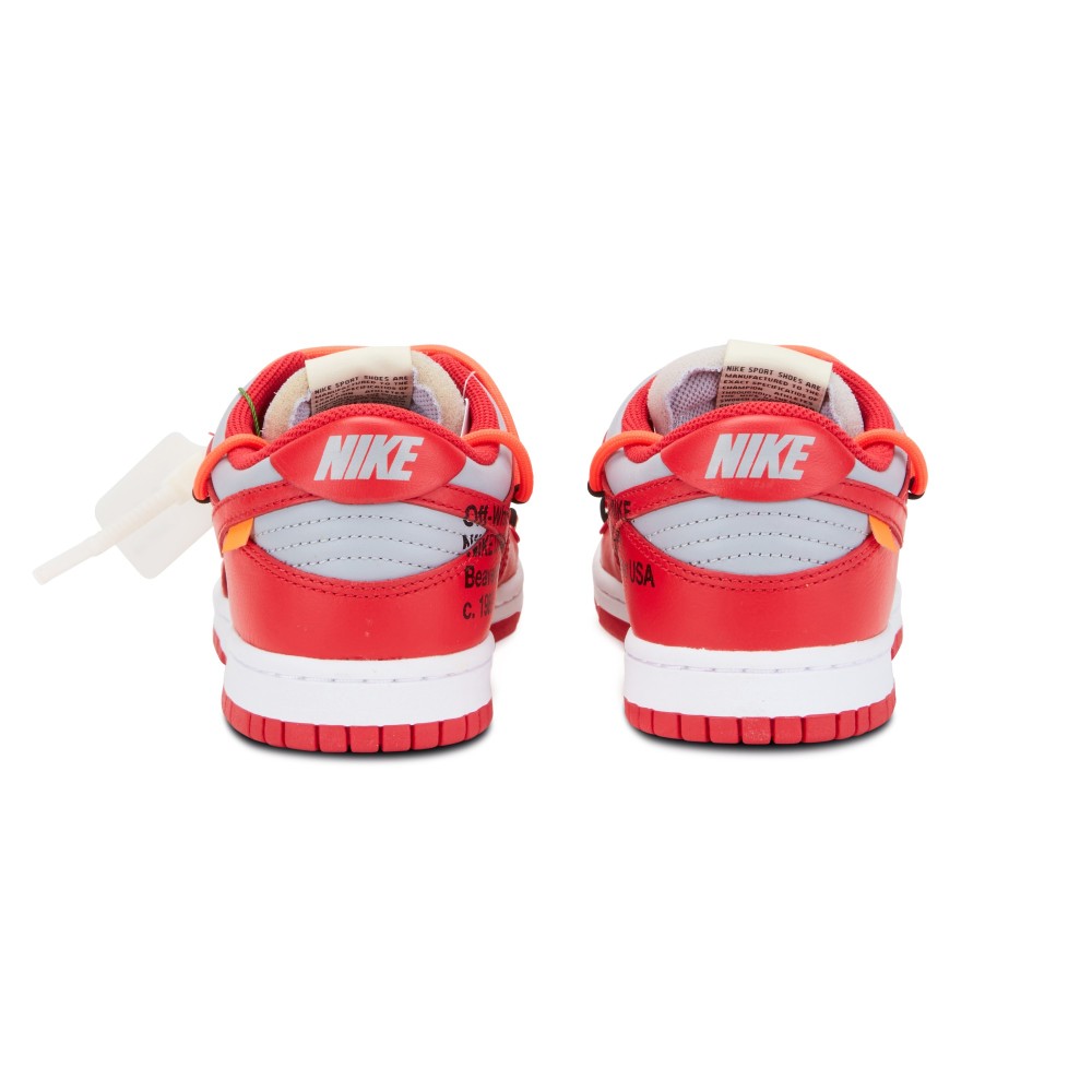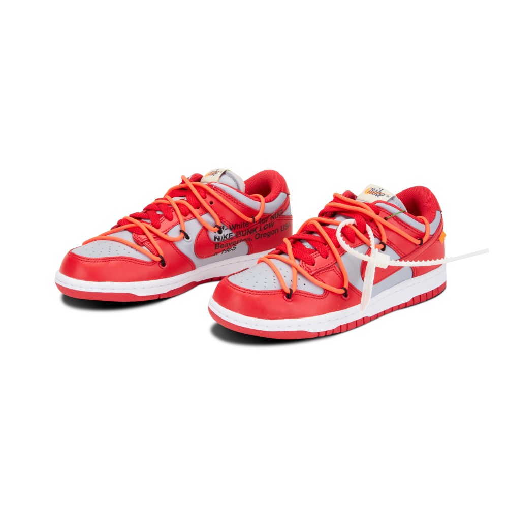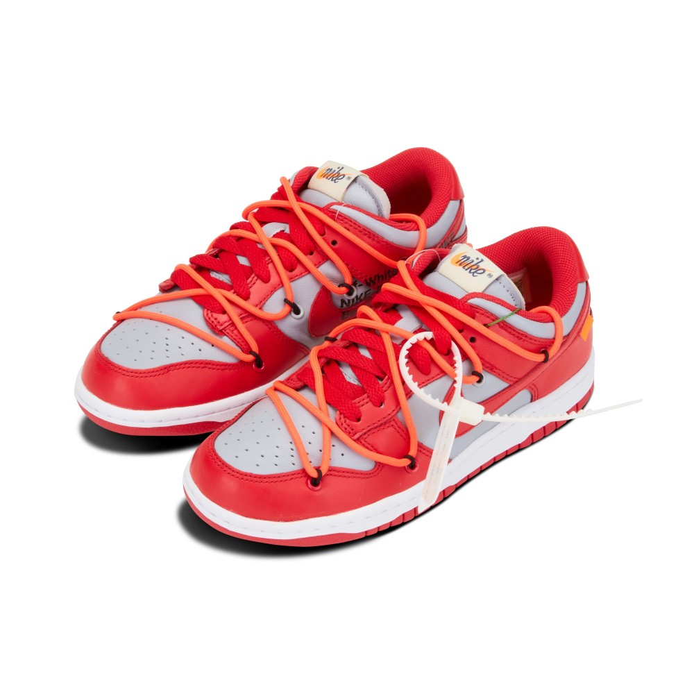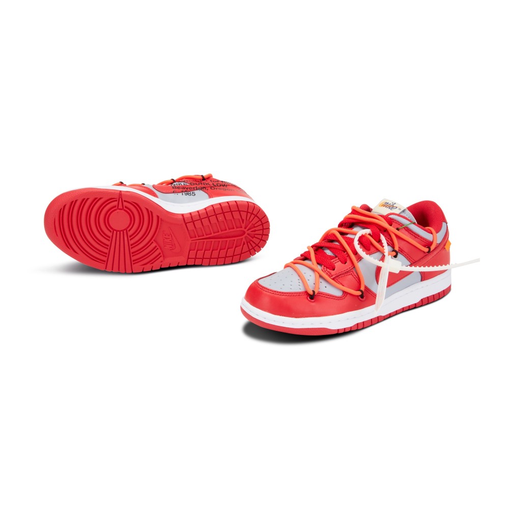 Virgil Abloh paid homage to skate culture?s adoption of 1980?s Nike basketball silhouettes with the Nike Dunk Low Off-White University Red. When Nike unveiled the Dunk as the centerpiece of their Nike College Colors program in 1985, seven different colleges were represented in the first colorways offered. The University Red colorway pays tribute to UNLV?s school colors. A Wolf Grey leather base covers the toe, mid-panel and ankle collar. University Red leather overlays contrast against the grey panels on the forefoot, toe, eyelets and heel with an orange flagged red Swoosh located on the mid-panel. Traditional red laces appear where they have always been, though Abloh opts to add a second set of bright orange laces in a staggered fashion throughout the upper. Completing the look of the limited-edition collaboration is a white rubber midsole with a red outsole. Originally released in 1985, Dunks have become one of the most iconic sneaker styles of all time and a blank canvas for design inspiration.