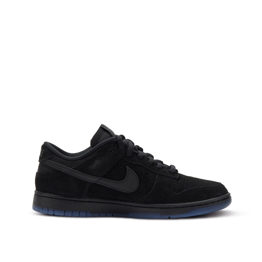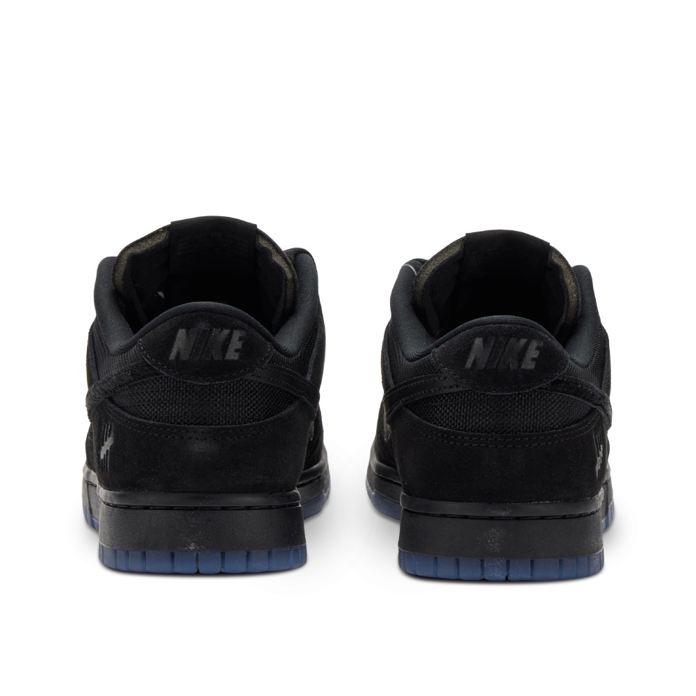The pair takes the classic Dunk Low silhouette, and dresses it in five high quality materials; premium suede, pony-hair, ostrich suede, nylon, and canvas, all in monochrome black. Undefeated?s signature five tally marks are debossed on the lateral heel and featured on the woven tongue labels. The look is finished with a dark blue, translucent outsole.