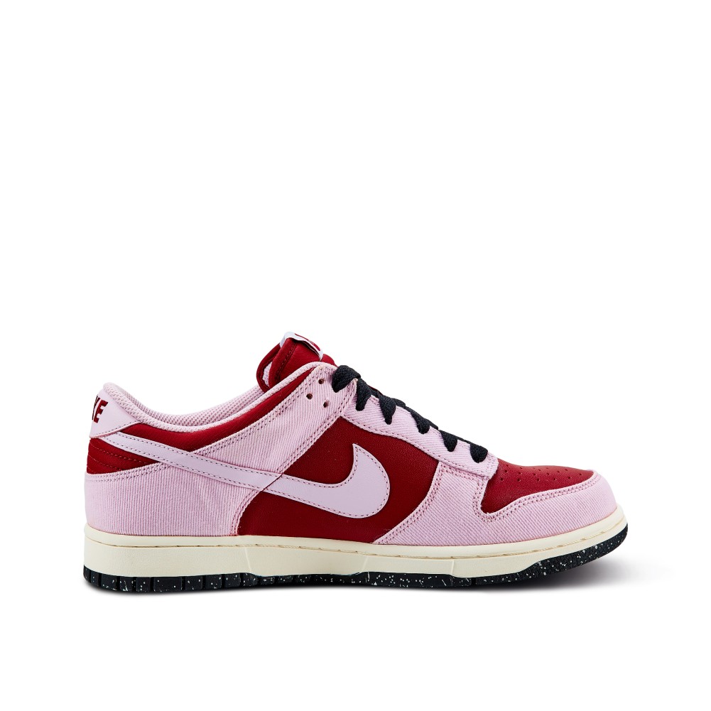 Manufactured in 2007, the Nike Dunk Low Women?s CL, boasts a red leather upper with light pink corduroy overlays. The sneaker sits atop a white cushioned midsole with a contrasting black speckled outsole. The pair comes with white shoelaces in addition to black.