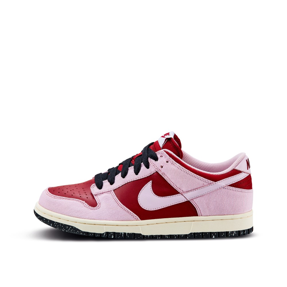 Manufactured in 2007, the Nike Dunk Low Women?s CL boasts a red leather upper with light pink corduroy overlays. The sneaker sits atop a white cushioned midsole with a contrasting black speckled outsole. The pair comes with white shoelaces in addition to black.
