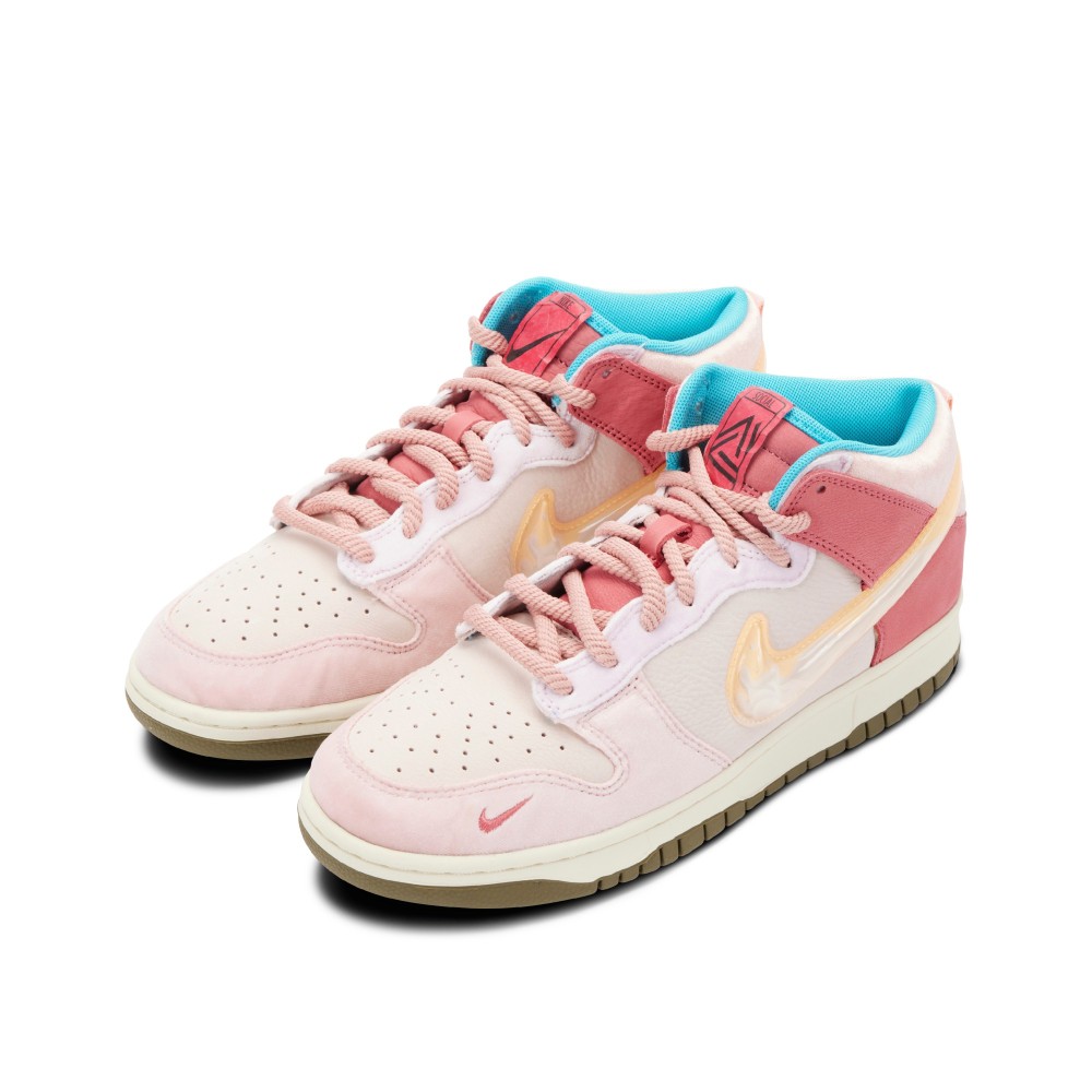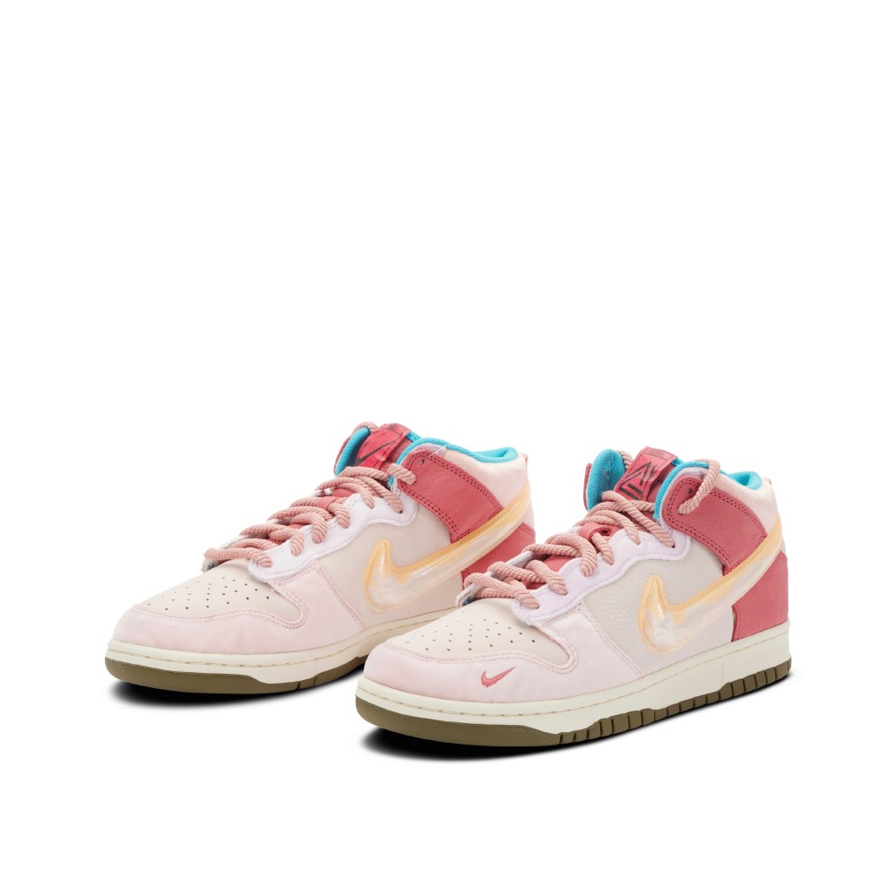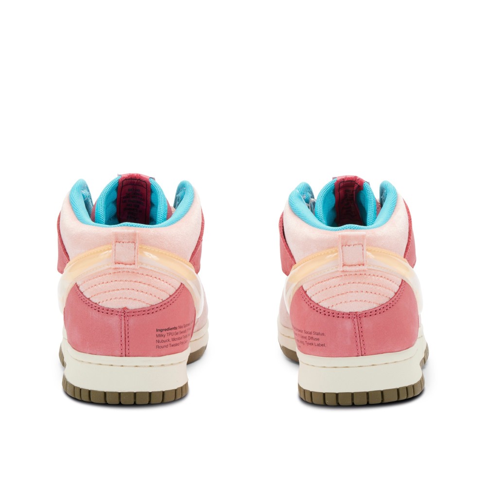 Part of the Social Status x Nike ?Free Lunch? Dunks twin collection, this style carries design elements that resonate with beverages that accompany federally funded free lunch programs in public schools. The upper of the ?Strawberry Milk? features a velour finish in different shades of pink throughout. Pink rope laces sit atop a juxtaposing olive green rubber outsole that is accessorised in addition to a semi-translucent TPU swoosh. To top it all off, thematic touches such as an ingredient list that describes the composition of the sneaker and red Tyvek tongue tags depicting NIke and Social Status logos are contrasted by the interior Turquoise lining.