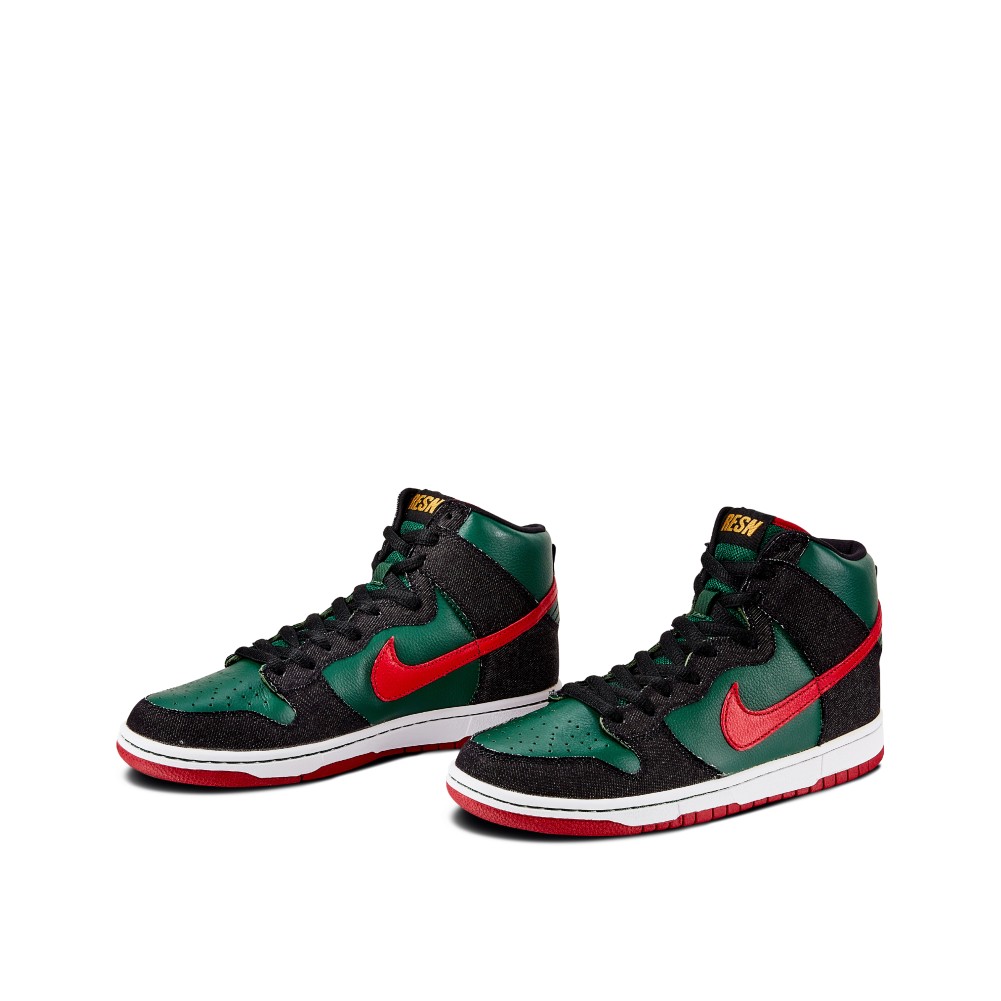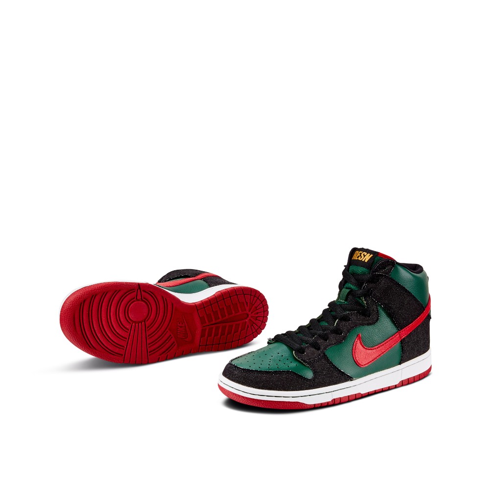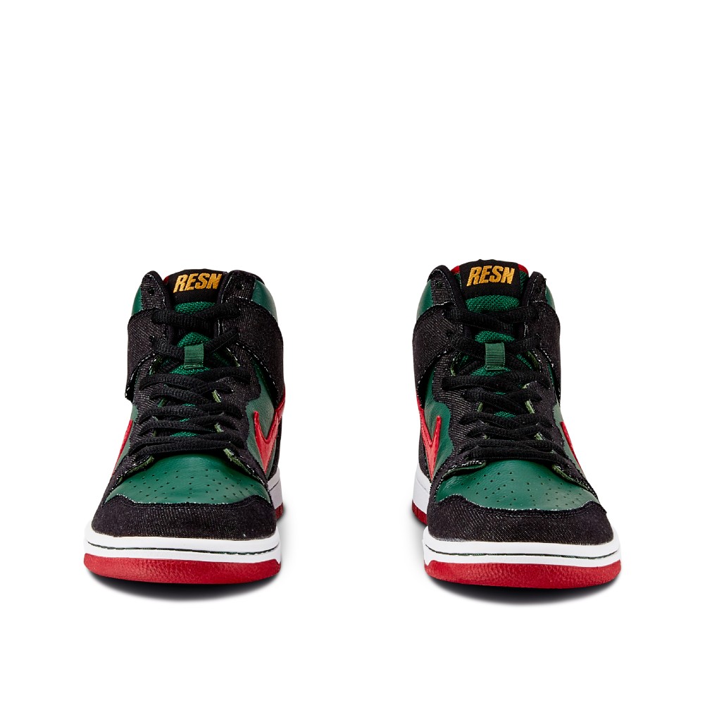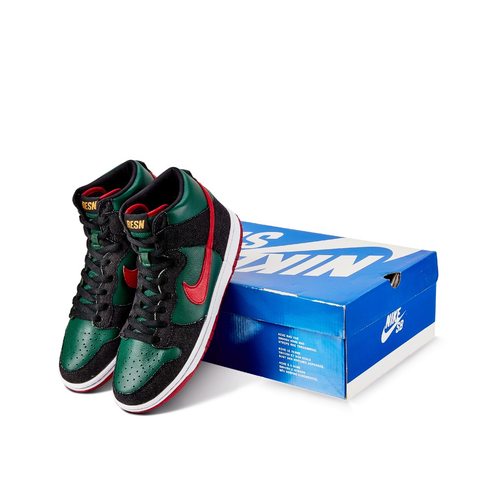 The Nike SB Dunk High Premium ?RESN? was released in 2009, and was originally slated to be dropped as part of the Nike SB Team Manager series. The ?RESN? moniker comes from Girl Skateboards team manager, Sam Smyth, tagging pen-name. The design features a Deep Forest leather upper with black denim overlays. Paprika red coloring is found on the rubber outsole and Swoosh.