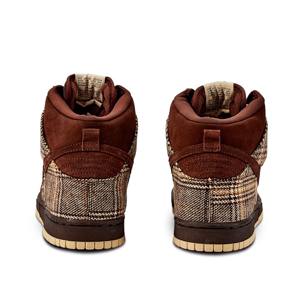 Both an SB Dunk High and Low silhouette released in September 2004, but the Nike SB Dunk High Tweed was not an identical rendition of the Low-cut counterpart. Inspired by Scottish craft and tradition, the upper was built of a baroque brown tweed, and matched with mushroom suede. The pair also comes with tan outsoles and matching laces. The Low-cut model featured a tan swoosh, and more mushroom suede panels on the lateral and medial sides.