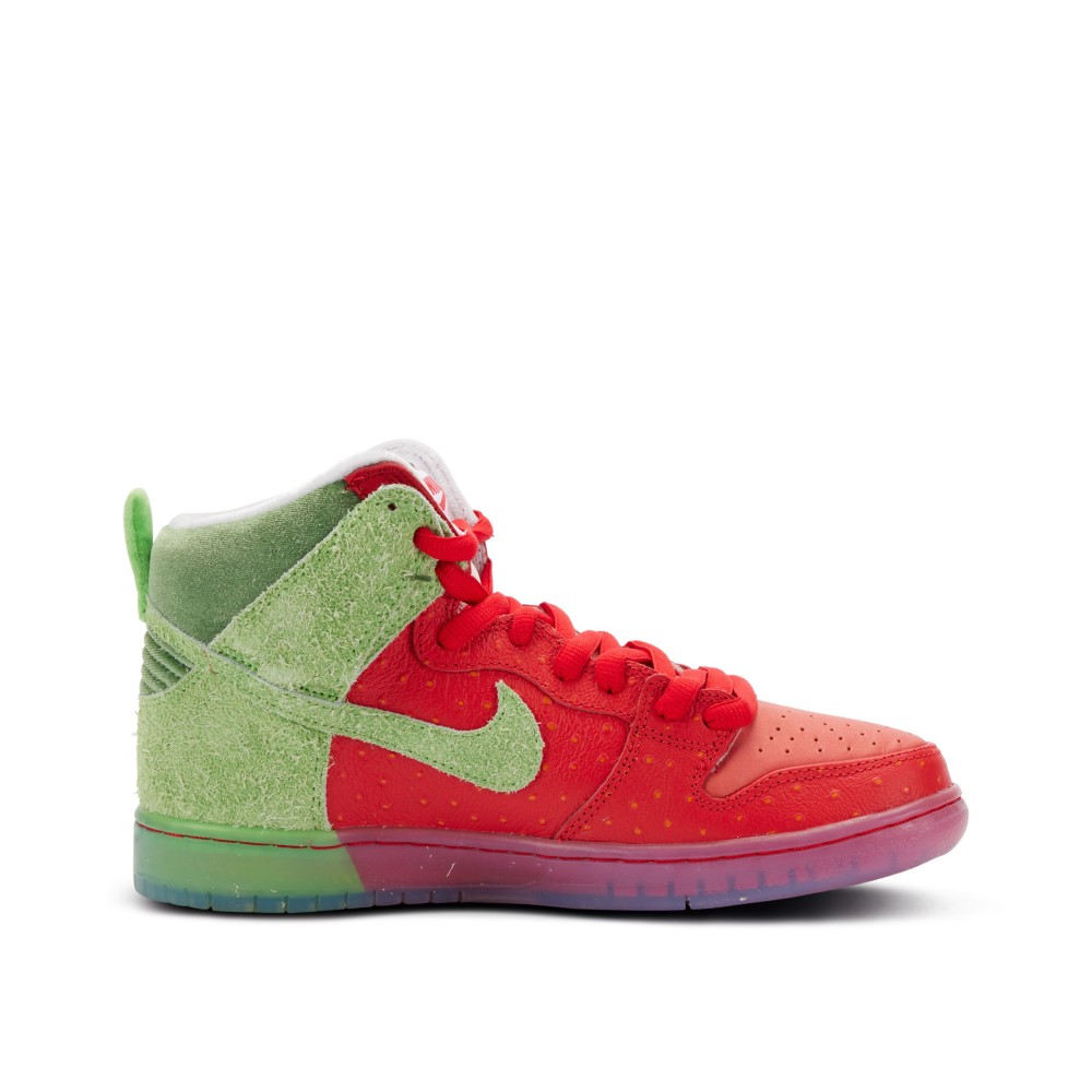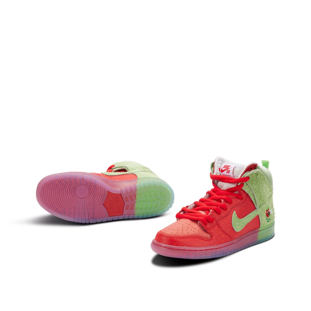 Designed by illustrator Todd Bratrud, the ?Strawberry Cough? Dunk is a nod to the cannabis strain the sneaker is named after. The silhouette features a textured red, dimpled leather upper with hairy green suede overlays to look like an actual strawberry. On the heels and insoles is a coughing strawberry logo that sits on top of a translucent outsole.