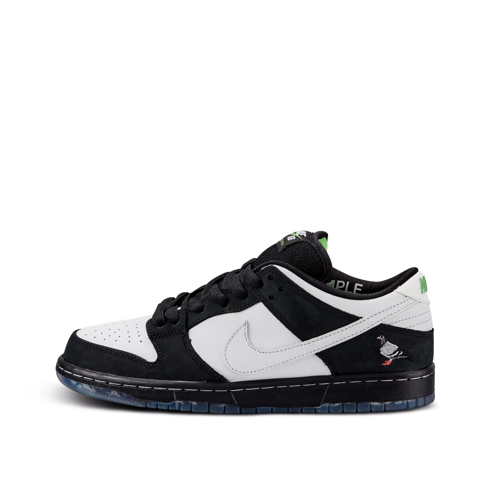 Creative visionary and graphic designer Jeff Staple collaborated with Nike to create a spinoff from the original 2005 ?Pigeon? SB Dunk. The Nike Dunk Low Pro SB ?Panda Pigeon? is the third release in the ?Pigeon? Dunk series and was released in 2019. The design, originally only meant to be a sample that Staple teased on social media, was brought to life after collectors caught a glimpse of the 2018 post. The model pays tribute to Staple?s Chinese roots and features his signature pigeon embroidered on the heel of the black and white leather upper. The translucent rubber sole portrays a collage of the front page of The New York Post from the day after the famed release of the original ?Pigeon? Dunk in 2005 that allegedly resulted in a sneaker riot. The Nike branding on the back heel is contrasted in lime green, with additional shoelaces and insole to match. The pair also comes with a pair of black and white shoelaces.