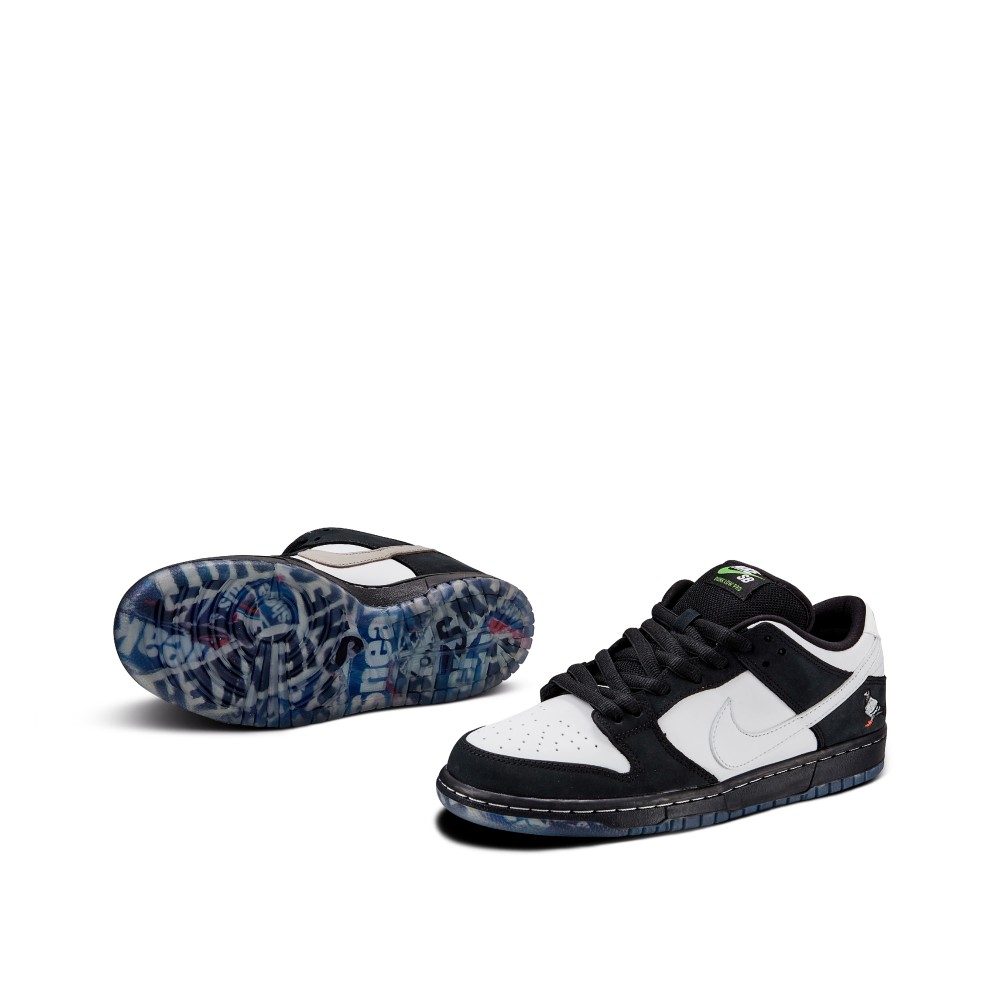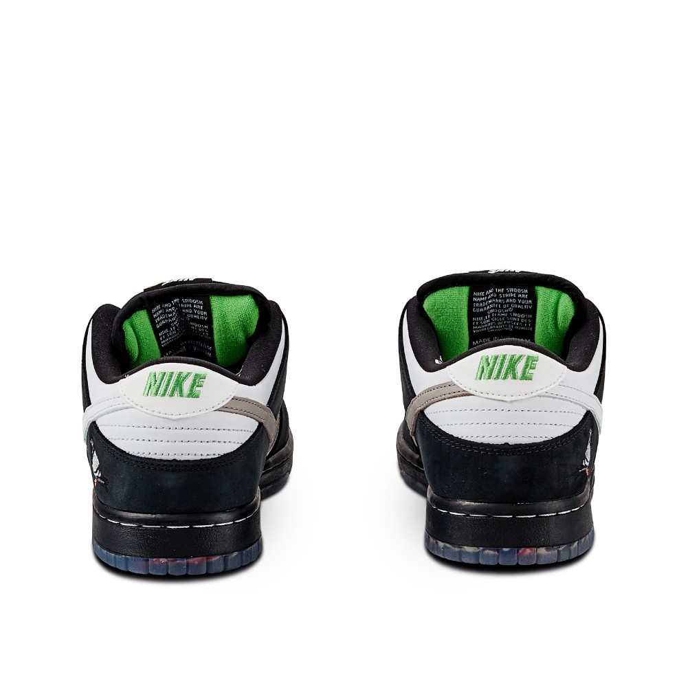 Creative visionary and graphic designer, Jeff Staple, collaborated with Nike to create a spinoff from the original 2005 ?Pigeon? SB Dunk. The Nike Dunk Low Pro SB ‘Panda Pigeon’ is the third release in the ?Pigeon? Dunk series and was released in 2019. The design, originally only meant to be a sample that Staple?s teased on social media, was brought to life after collectors caught a glimpse of the 2018 post. The model pays tribute to Staple?s Chinese roots and features his signature pigeon embroidered on the heel of the black and white leather upper. The translucent rubber sole portrays a collage of the front page of the New York Post from the day after the famed release of the original ?Pigeon? Dunk in 2005 that allegedly resulted in a sneaker riot. The Nike branding on the back heel is contrasted in lime green, with additional shoelaces and insole to match. The pair also comes with a pair of black and white shoelaces.