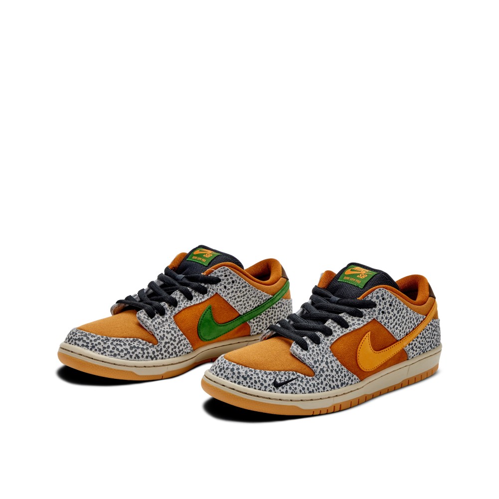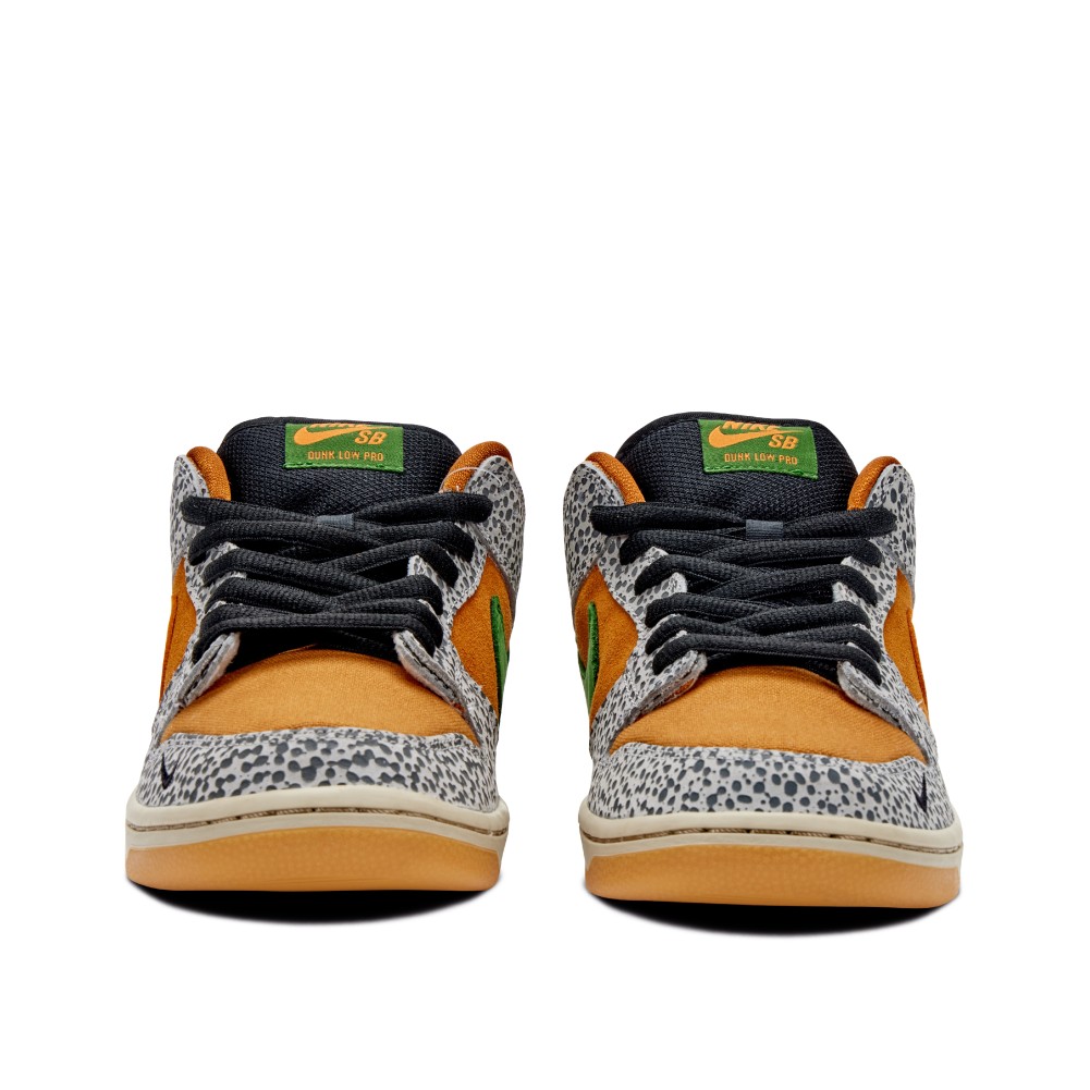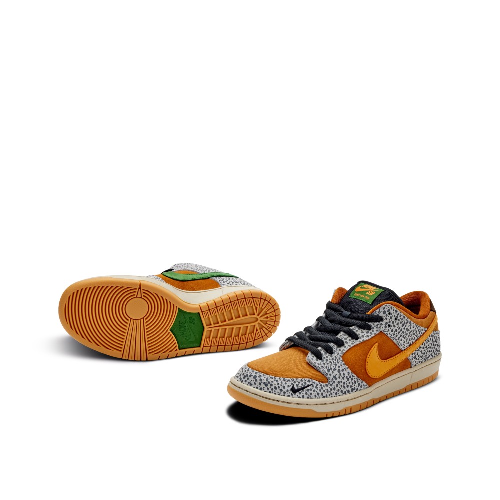Inspired by the original atmos x Air Max 1 collaboration from 2003, Nike SB paid homage with the release of the Dunk Low Safari. The style consists of a canvas and suede upper with leather “Safari” printed overlays. Green detailing, additional Swoosh on the mudguard and a contrasting sole complete the design.