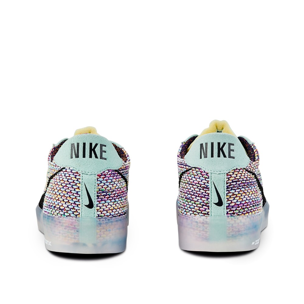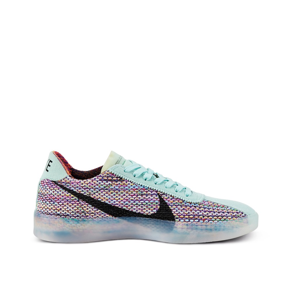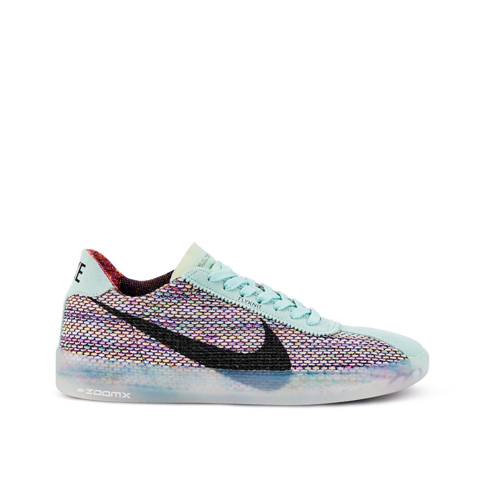 This silhouette pays homage to Sandy as a runner and his impact on Nike Skateboarding by updating the 1972 Nike Bruin for skateboard use. The upper is constructed of Flyknit woven fabrics and has hues to mimic the colors found in ?Blue Sky Dreamer? by Mark Smith; the painted portrait of Sandy still hangs in The Bodecker Foundation space in Portland, Oregon. Other notable details include the teal midsole, eyestay and tongue with an additional note that reads ?engineered to the exact specifications of world class skateboarders? across it. This shoe had a limited release exclusively in Tokyo, and it is rumored that there were only 80 pairs in circulation.