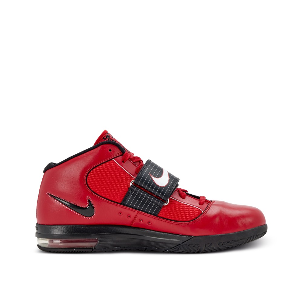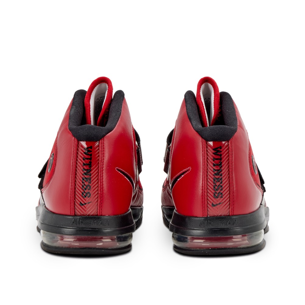 This PE is dressed in a red upper, with a flyknit mid strap in black with white Swooshes. Special details include LeBron James branding on the lateral lace locks and the lion on the tongue. This is also the first Zoom Soldier model to include an Air Max sole.