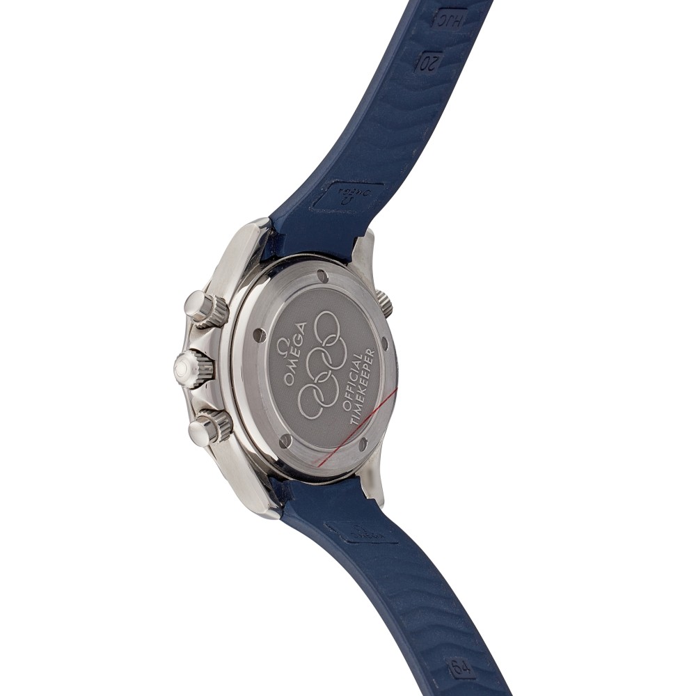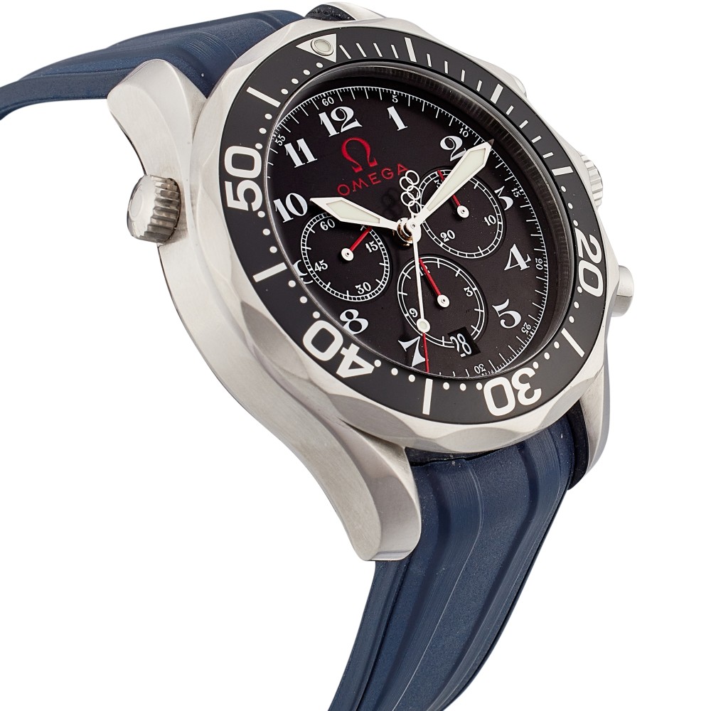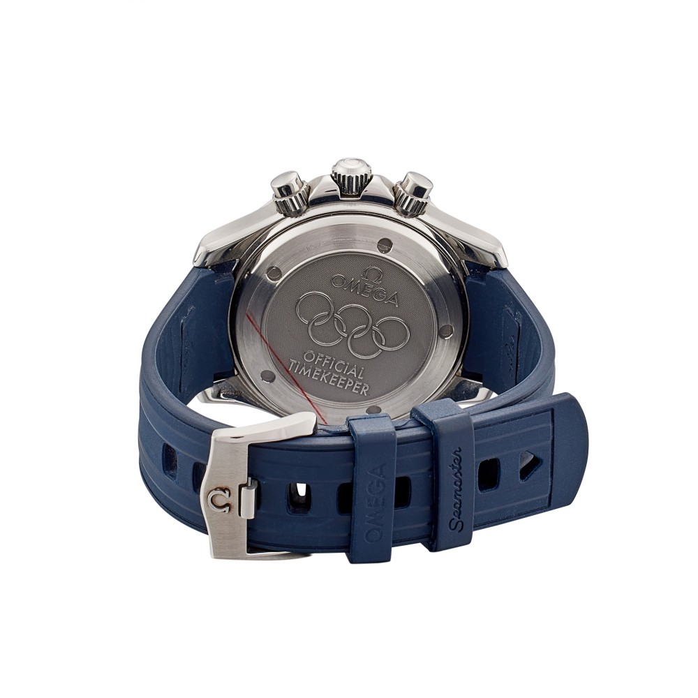 This Olympic Collection Timeless reference 2896.51.91 is a stainless steel automatic wristwatch with chronograph, case diameter in 41.5mm stainless steel. Water resistance 300 meters. A hand on a sub-dial which tracks seconds typically completes a full rotation in one minute. Dial color in black. Crystal with domed anti-reflective, scratch-resistant sapphire crystal. Blue rubber strap with stainless steel pin buckle. Movement caliber OMEGA 3303, self-winding chronograph with column wheel mechanism. Officially certified chronometer. Rhodium-plated finish. Geneva waves. Power reserve approximately 55 hours.
