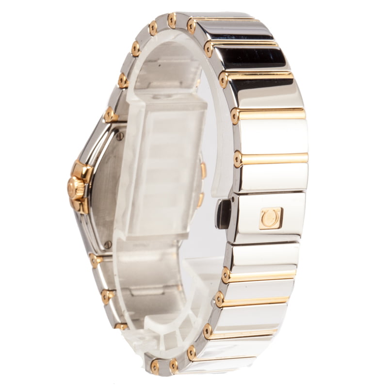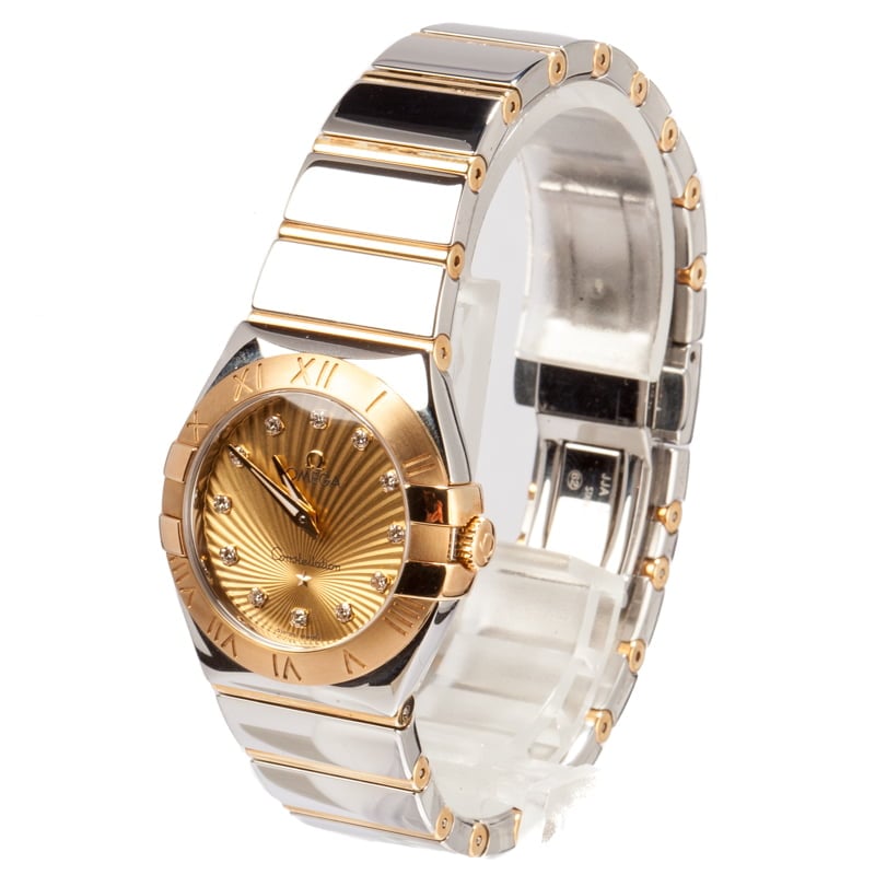 Buy a diamond dial Omega Constellation today for a very competitive pre-owned price. Reference 123.20.27.60.58.002 is a gorgeous edition of the famed dress watch, complete with the Constellation’s signature integrated bracelet and bezel featuring Roman numeral graduations and decorative claws, or “Griffes”. What sets this pre-owned Omega apart from other Constellation watches is the gorgeous steel and gold case and champagne dial. The dial is decorated with brilliant-cut diamond hour markers and features a sweeping “Supernova” design that radiates from behind the Constellation star logo. At 27mm in diameter, this lady’s Omega will look and feel exceptional on the wrist anywhere you roam.