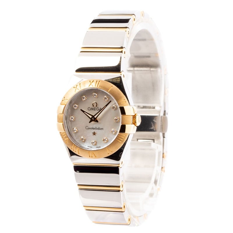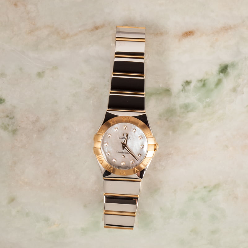The Constellation ref. 123.20.24.60.55.004 is an excellent gateway into gold Omega ownership. The gorgeous two-tone stunner pairs the 18k yellow gold with stainless steel, allowing it to maintain a very attractive pre-owned Omega price. Not to mention two-tone watches are coming back into fashion. The Constellation is a pillar of the Omega catalog, coming to market in 1952 and continuing production today. It’s available on the secondary market in a seemingly countless variety of design set options, including the gorgeous women’s Omega for sale here. This edition also features a classy white Mother-of-Pearl dial with diamond hour markers and the Constellation’s signature Griffe bezel.