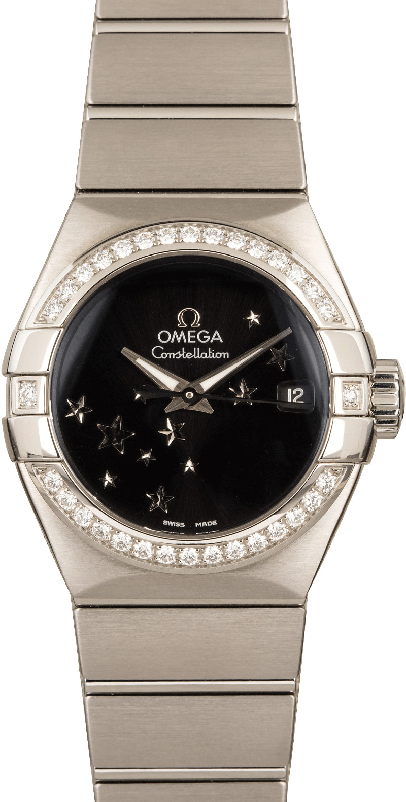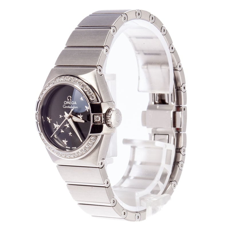 Bob’s Watches is the best place to buy an affordable diamond luxury watch. We boast the largest selection of certified pre-owned watches on the secondary market. Additionally, every watch for sale is listed in stock and can ship to your door as soon as tomorrow! The Constellation is a famous Omega wristwatch in production for decades. It’s characterized by an integrated bracelet and a bezel flanked by Griffes. The Omega 123.15.27.60.51.001 for sale here is a gorgeous stainless steel example decorated with a diamond-encrusted bezel and a stunning black dial adorned with twinkling stars to mirror the night sky.